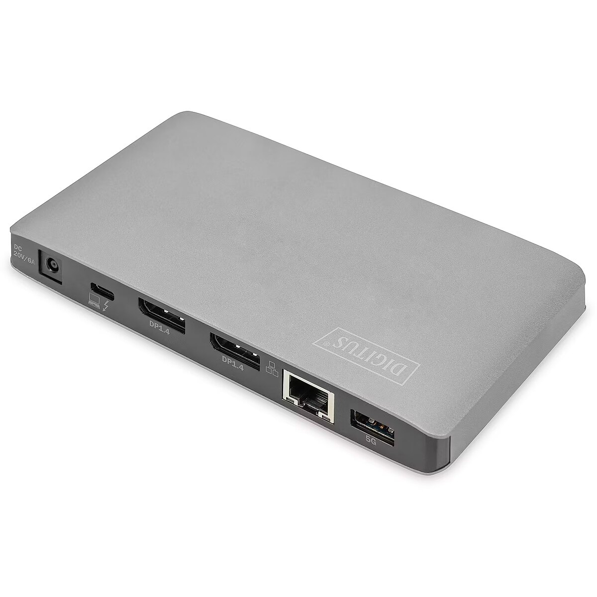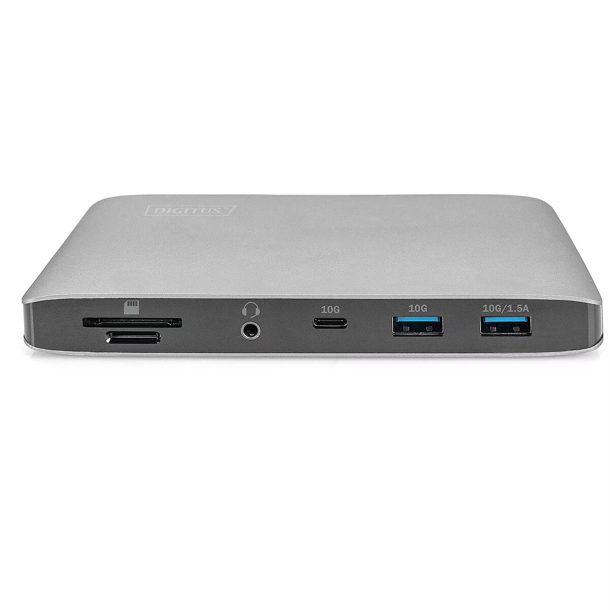 Description - The Thunderbolt 3 dock provides 10 additional ports, including for video, data, power, ethernet connectivity and audio The DIGITUS Thunderbolt 3 docking station expands your notebook by another 10 ports via just one USB-C port. It offers e.g. 2 DisplayPort video ports for connecting monitor, beamer and TV. With dual monitor support, you can operate your displays simultaneously. Under Windows, you can output video signal to two different video ports simultaneously (SST mode), and you can also display two different video signals through 2 video ports (MST mode). Only SST mode is supported on Mac OS. The other interfaces provide all the common connectivity options that a modern docking station must offer. For example, there is a network port, further USB connectors (USB-C, USB-A), audio output and two independent card readers. The integrated USB-C port with support for Power Delivery (PD Charging) allows you to charge your laptop while using the docking station. In addition, the docking station offers various USB-C and 3.0 ports for data transfer, connecting peripherals such as mice and keyboards, and charging mobile devices. You can expand the functionality of your notebook, and thus also your capabilities, all you need is a free USB-C port. 10 extra connectors on your notebook for video, data, power, ethernet and audio Support for 4K Ultra HD (4096 x 2160 30-bit color @ 60Hz) on dual monitors or 8K @ 30Hz on a single monitor via Thunderbolt 3 Support for 4K @ 30Hz on dual monitors when connected to devices with DisplayPort 1.4 (HBR3) and 1080p @ 60Hz on dual monitors when connected to devices with DisplayPort 1.2 (HBR) 2) via USB-C Support dual displays under Windows OS mirroring mode and monitor screen extension Mac OS single display support monitor screen mirroring 3 x USB 3.0 2 x with SuperSpeed data transfer up to 10 Gbps, one port with BC 1.2 functionality for charging mobile devices (max. 1.5 A), 1 x with SuperSpeed data transfer up to 5 Gbps 1 x Thunderbolt port with Power Delivery (PD), data transfer rate up to 40 Gbps Supports Power Delivery 3.0 (max. 60W) for fast charging of the user's notebook/laptop 1 x Gigabit LAN 10/100/1000Mbps RJ45 port 1 x SD card slot and one microSD card slot: Supports SD 3.0 (UHS-I), SD 4.0 (UHS-II)
