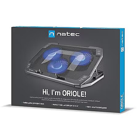 Natec Oriole is a rugged cooling stand dedicated to 17.3" laptops.  Its high efficiency is the result of having 3 fans. There are also many features that make it easy to adjust it to your own expectations. Fan speed control? Adjustable degree of inclination? With Natec Oriole it is possible. And this is just the beginning.