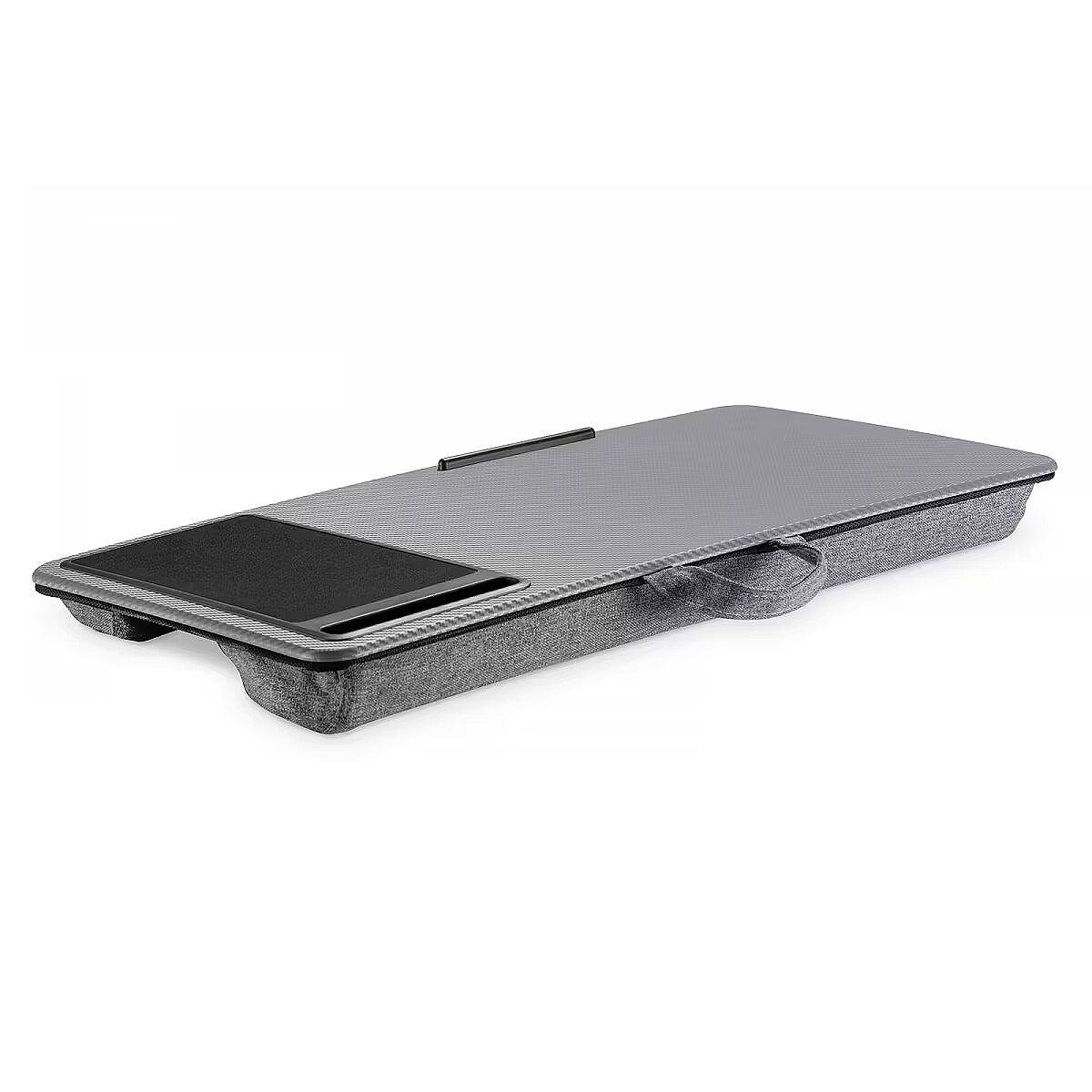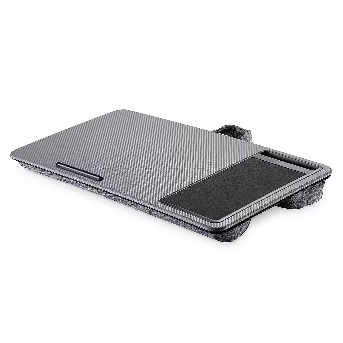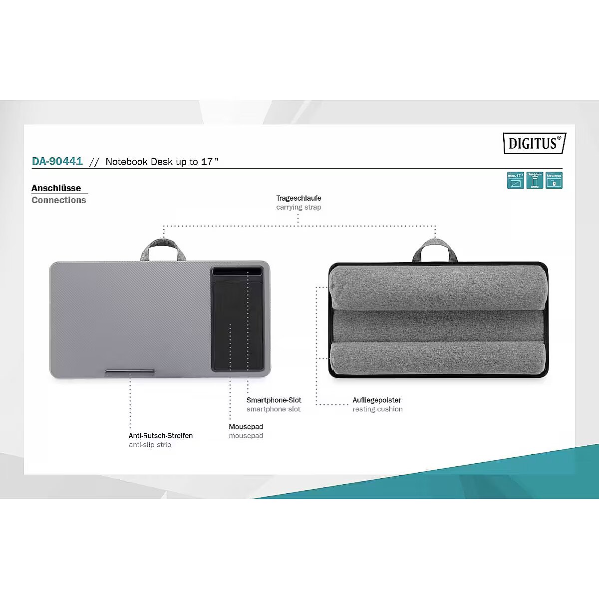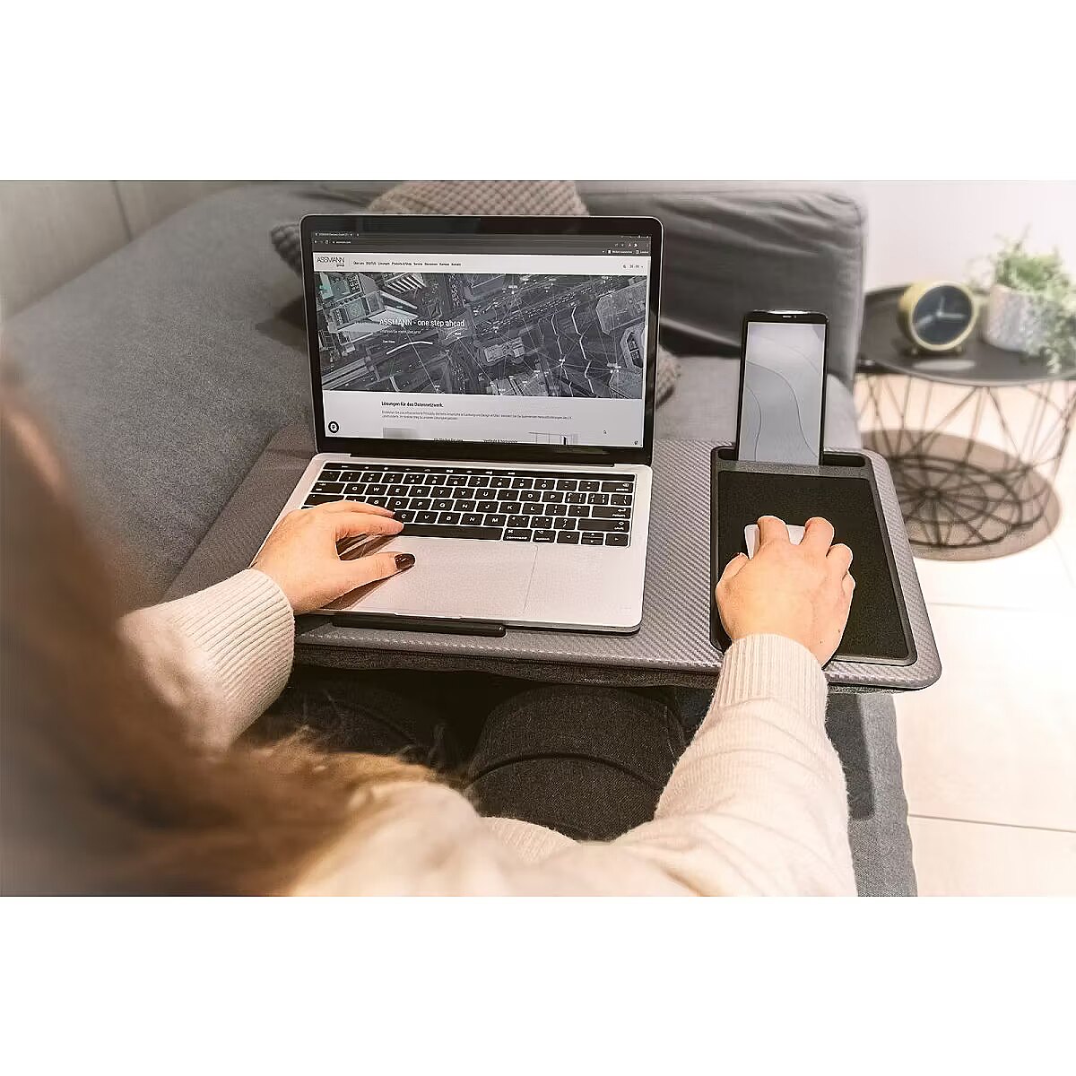 Description - The notebook stand allows you to work anywhere for maximum flexibility. The handle on the bottom prevents the notebook from slipping even when working in a tilted position. The soft pads on the underside provide comfortable use and stable support. Suitable for notebooks with a screen size of up to 17 inches Integrated mouse pad Integrated smartphone stand Soft padding on the underside Suitable as a stand to raise the surface on your desk Notebook holder on the underside provides stable support even in a tilted position Practical carrying handle Material: Plastic/cotton