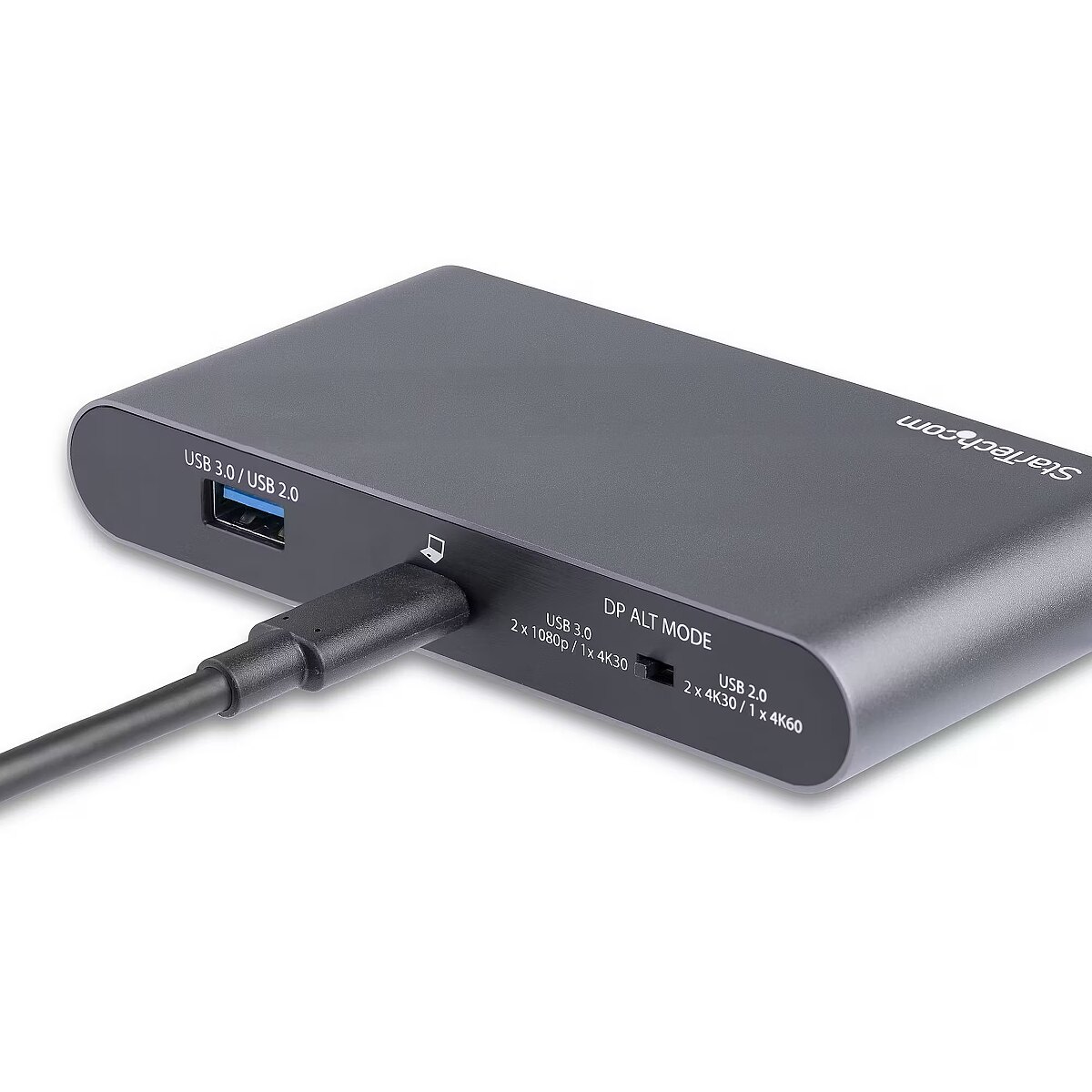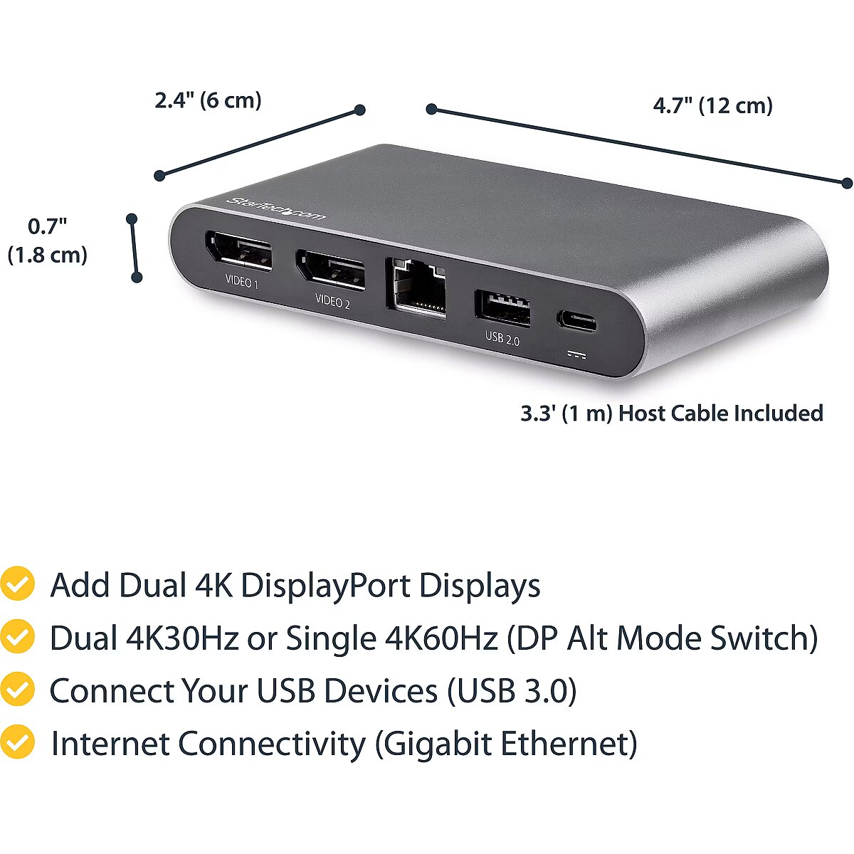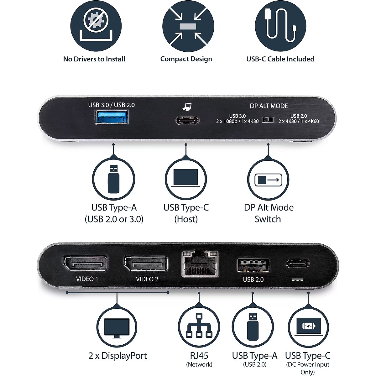 LongDesc - USB C Multiport Adapter | 4K 30Hz | 100W PD 3.0 | 2 USB A Ports | GbE | DP Alt-Mode SwitchTransform your Windows laptop into a dual monitor workstation using this USB-C docking station. It offers support for dual DisplayPort monitors, 2 USB-A peripherals, a LAN port for GbE network access and an extended 1-meter host cable.DisplayPort™ Alternate Mode to Choose Your Video Display OutputAchieve dual 1080p up to a single 4K 60Hz display using the DisplayPort™ Alternate Mode (DP Alt-Mode) configuration switch.Switch LeftSwitch Right2 Lane DP Alt- Mode4 Lane DP Alt ModeUSB 3.0(5Gbps)USB 2.0(480 Mbps)Dual 1080p MonitorsorSingle 4K 30Hz MonitorDual 4K 30Hz MonitorsorSingle 4K 60Hz MonitorReliable 100W Power Delivery PassthroughThe USB-C multiport adapter uses your USB-C laptop’s power adapter and can provide up to 100W Power Delivery (3.0) pass through with up to 85W for your host device for charging. The remaining wattage will power the docking station along with any attached USB-A peripherals such as smartphones and tablets.Multi-Stream Transport for Driverless DisplaysThe multi-stream transport technology (MST) in this dock powers two DisplayPort monitors with no driver installation required so you are up and running faster.Enhance Productivity and Device Management with the StarTech.com Connectivity Tools ApplicationDeveloped to improve performance and security, StarTech.com Connectivity Tools is the only software suite on the market that works with a wide range of IT connectivity accessories. The software suite includes:•Advanced Windows Layout Utility : To setup and save custom windows layouts.•Mac Address Pass-Through Utility : To improve network security.•USB Event Monitoring Utility : To track and log connected USB devices•Wi-Fi Auto Switch Utility : Enabling users to quickly access faster network speeds via wired LAN.For more information and to download the StarTech.com Connectivity Tools application, please visit: www.StarTech.com/Connectivity-ToolsComprehensive Product Testing & Expert Technical SupportStarTech.com conducts thorough compatibility and performance testing on all our products to ensure we are meeting or exceeding industry standards and providing high-quality products to our customers. Our local StarTech.com Technical Advisors have a broad product expertise and work directly with StarTech.com Engineers to provide support for our customers both pre and post-sales.This docking station is backed by a StarTech.com 3-Year warranty and free lifetime technical support.The StarTech.com Advantage