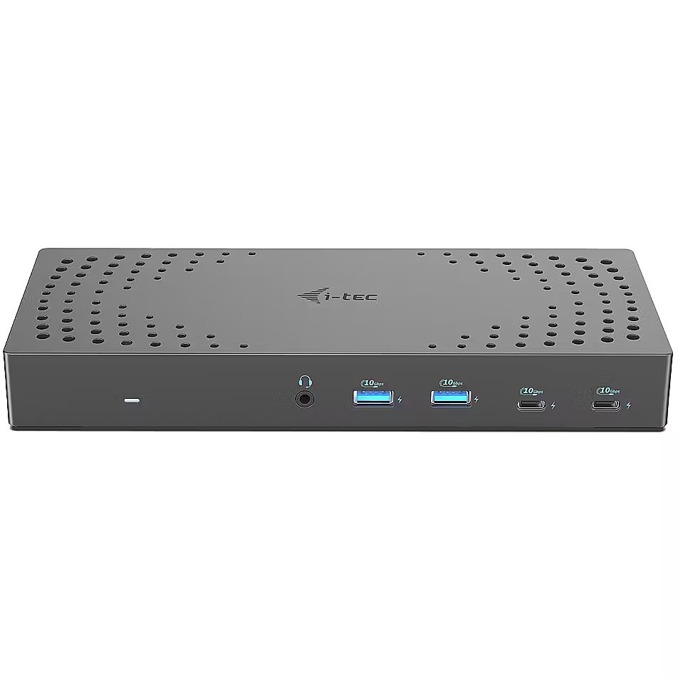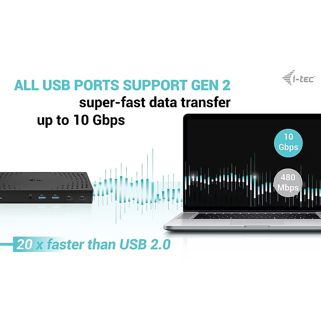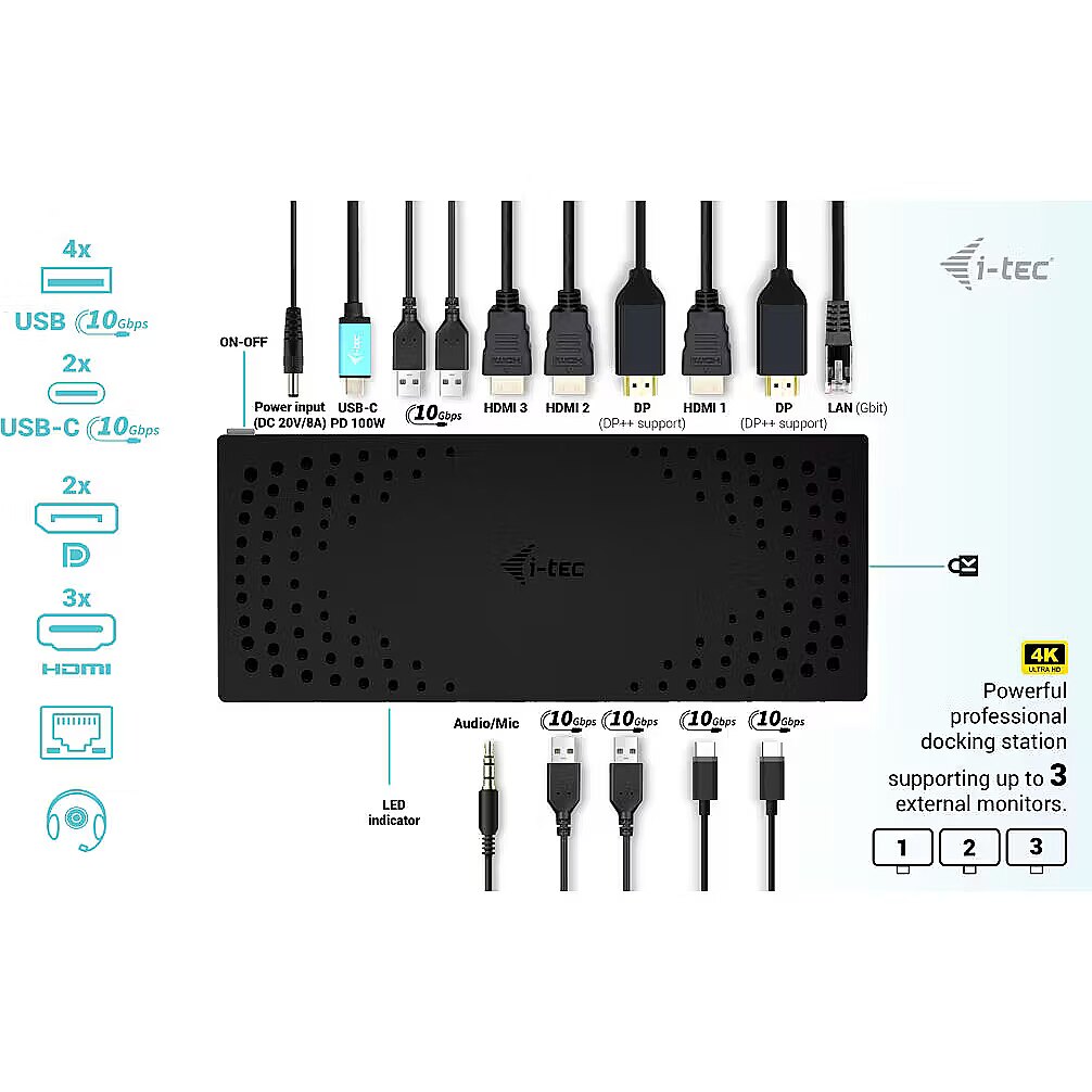Description - Maximum performance docking station for up to three monitors simultaneously It has 6 USB ports with a transfer speed of 10Gbps each The docking station is compatible with all modern notebooks (connects via USB 3.0, USB-C or Thunderbolt 3/4 ports) It supports high resolution 4K with a refresh rate of up to 60Hz The docking station supports up to 100W of power to power a connected notebook or tablet (when connected via USB-C or ThunderboltTM port. Laptop cannot be charged when connected via USB 3.0 port). 4x USB 3.2 Gen 2 (10 Gbps) and 2x USB-C Gen (10 Gbps) for easy connection of USB devices and peripherals GLAN Ethernet supports speeds of 10/100/1000 Mbps for a solid and fast internet connection. The combined 3.5mm audio/mic port can connect e.g. integrated headphones with microphone The dock is a VESA compatible dock mount for mounting behind a VESA compatible monitor Optional MAC address cloning and automatic data backup of connected PC (enabled by free i-tec Docker Pro software).i-tec Docker Pro software). i-tec Docker Pro software). Powerful Gen 2 professional dock that supports up to three external monitors in high resolution up to 4K. The docking station can be used with virtually all notebooks, as it supports connection to all popular ports: USB 3.0, USB-C and Thunderbolt 3/4, while supporting all popular current operating systems. However, connecting up to three monitors will only be possible if the laptop has a Thunderbolt 3/4 port or a USB-C port that supports image transfer (USB-C DP Alt mode). When connected to a notebook with a USB 3.0 port, only two monitors will be supported. Plenty of USB ports (all supporting Gen 2 speeds up to 10 Gbps), reliable and fast connection to the corporate network thanks to the integrated LAN port, and the ability to install behind a monitor all make this docking station the perfect companion for true professionals. Of course, it supports charging a laptop or tablet, up to 100W. Connect up to 3 external monitors with up to 4K resolution* Power Delivery: up to 100W 2 DisplayPorts and 3 HDMI ports available* 4x USB 3.2 Gen 2 (10 Gbps) and 2x USB-C Gen 2 (10 Gbps) for easy connection of USB devices and peripherals Gigabit Ethernet RJ-45 provides reliable, robust and fast Internet connectivity with support for 10/100/1000Mbps speeds Combo jack for audio and microphone The Kensington lock provides protection against theft, especially in shared offices or public places The power switch of the docking station enables maximum energy saving The docking station allows for intelligent vertical installation behind a VESA-compatible monitor Supports Windows 10/11, macOS, Android 5 or later, Chrome OS R51 or later, Linux Ubuntu *The HDMI 3 port will only work when connected to a laptop with a Thunderbolt 3/4 port or a USB-C port that supports video transfer (so-called USB-C DP Alt Mode) If the dock is connected via USB 3.0, charging is not supported.