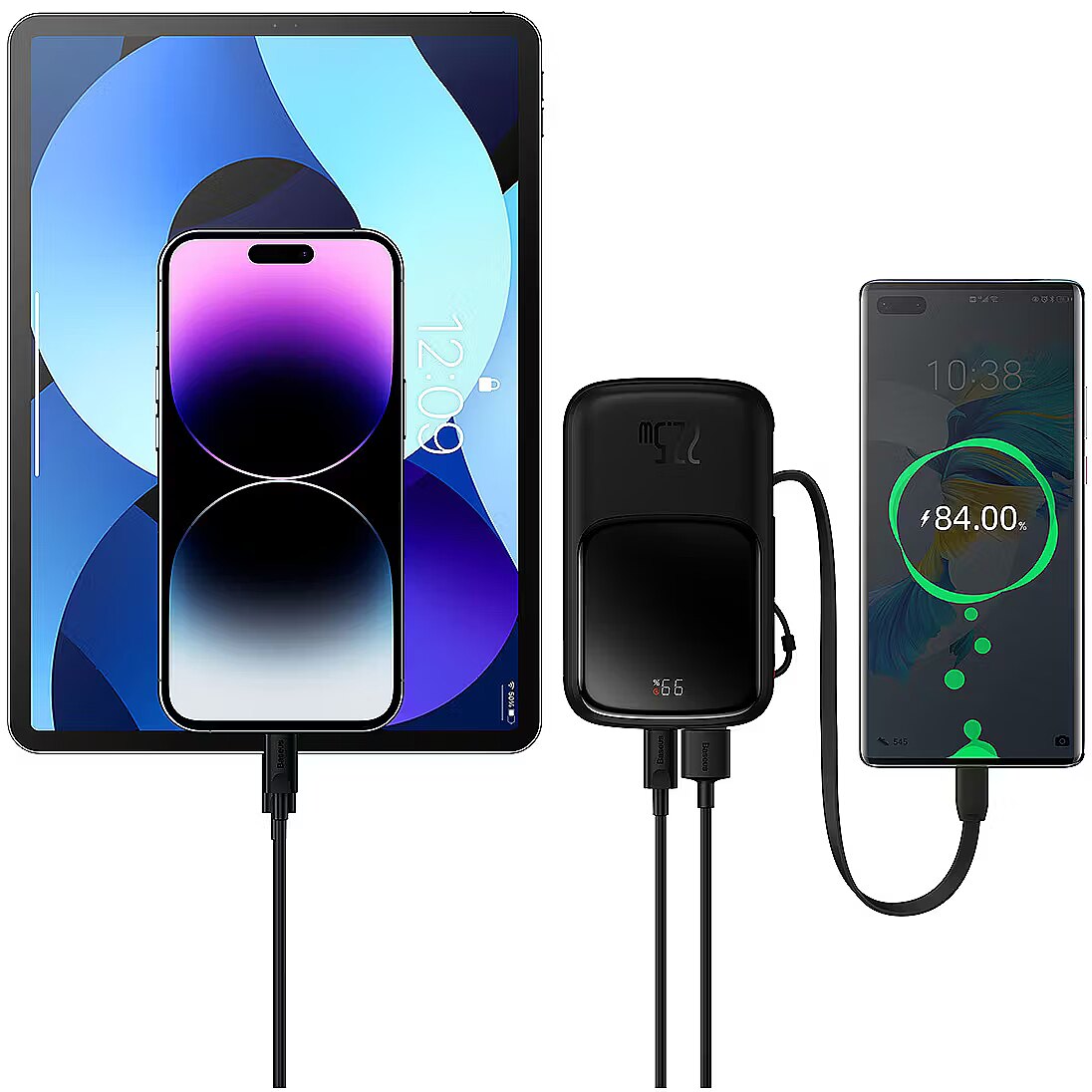 The Baseus Qpow Pro powerbank with USB-C cable allows you to charge up to 3 devices simultaneously. The USB-C cable charges with 22.5 watts of power, plus the powerbank has USB and USB-C outputs, allowing you to renew the power of several different devices at once. It supports SCP, FCP, QC and PD protocols, and will charge an Apple 13 to 50% in just 30 minutes. Impressive capacity