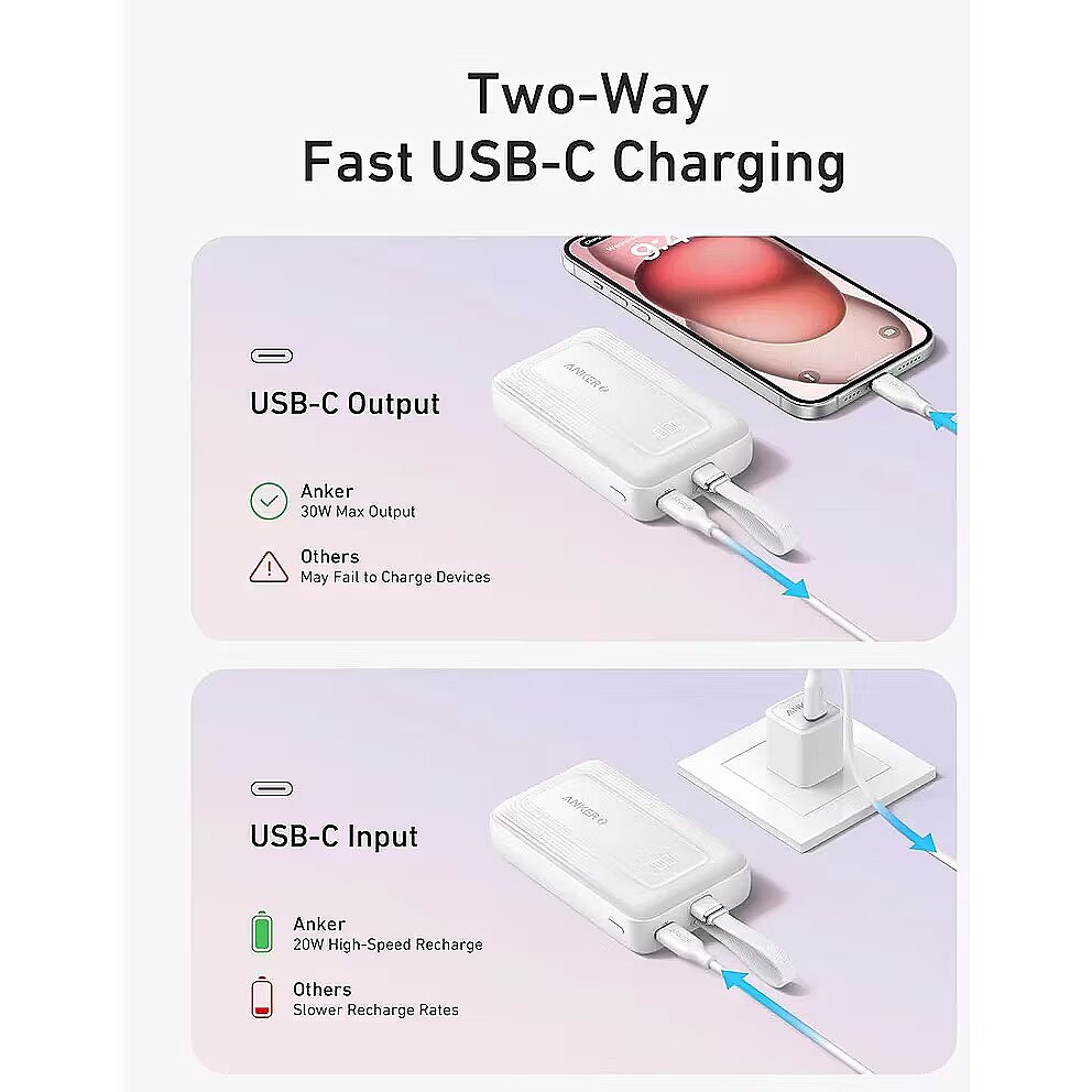 LongDesc - - Speedy 30W Charging: Experience the cutting-edge speed of 30W fast charging technology that propels your iPhone 15 from 0 to 57% battery in just 30 minutes.- Ready for Endless Use: Crafted for durability, the 5.4-inch built-in USB-C cable is tested to endure over 10,000 bends, ensuring it stands up to the rigors of everyday use.- Mighty Compact Power: This compact and powerful 10,000mAh power bank provides up to 2 full charges for an iPhone 15 and 1.94 charges for a Samsung S24, making it ideal for travel.- 30W Bi-Directional Charging: With two-way fast USB-C charging, enjoy up to 30W output and 20W input, ensuring your gadgets are quickly powered. (Note: Compatible with iPhone 16/15 Series, MacBook, Galaxy, iPad, Switch, Steam Deck, and more.)- What You Get: Anker Zolo Power Bank (10K, 30W) with a 5.4-inch (13.7 cm) built-in USB-C cable.