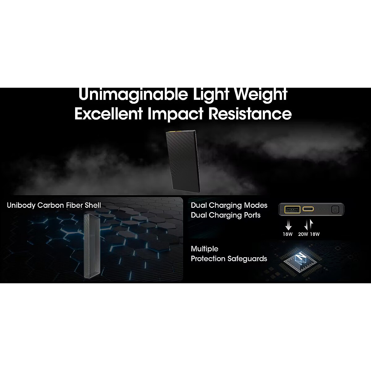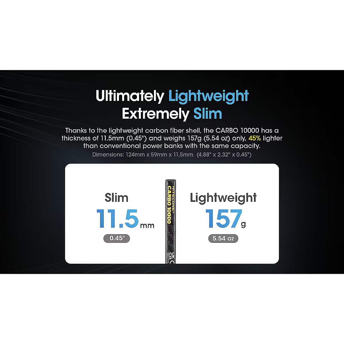 Description - CARBO 10000 Technical Data Cell: Li-ion Capacity: 10,000mAh 3.85V (38.5Wh) Rated Energy: 6,400mAh 5V (TYP 1A) Input: USB-C: 5V⎓2.4A / 9V⎓2A Output: USB-C: 5V⎓3A / 9V⎓2.22A / 12V⎓1.68A USB-A: 5V⎓3A / 9V⎓2A / 12V⎓1.5A Dual Ports: 5V⎓3A (MAX) Dimensions: 124mm x 59mm x 11.5mm (4.88" x 2.32" x 0.45") Weight: 157g±5g (5.54 oz±0.1 oz) Accessory: USB-C Charging Cable