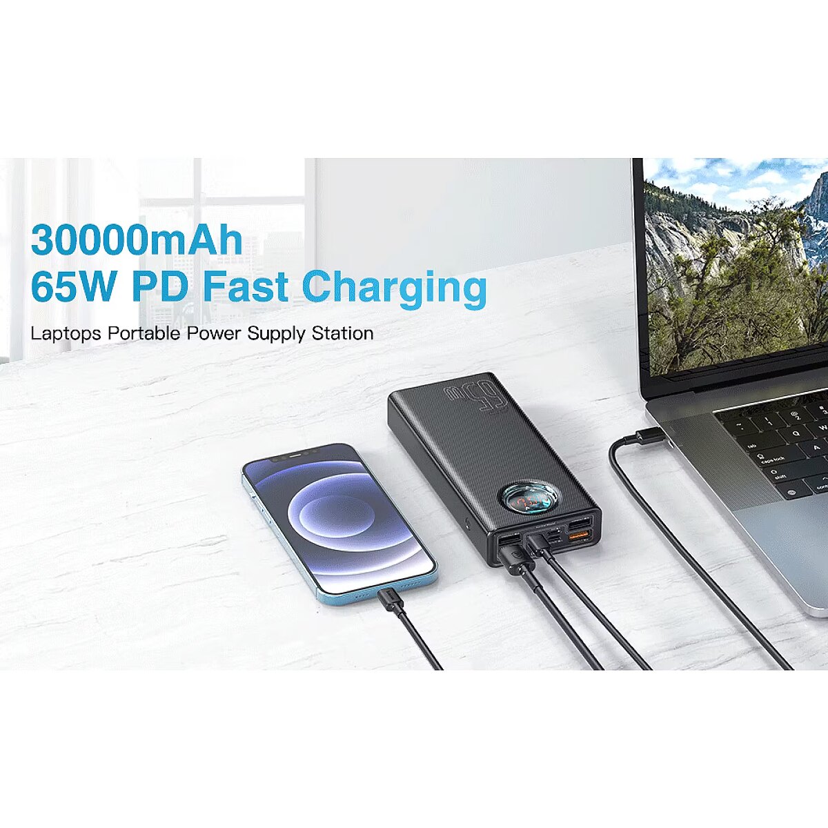 description_en - Use the Baseus Amblight 30000mAh powerbank to quickly charge devices such as a smartphone or laptop. The product uses 65W of power and works with PD, QC, SCP fast charging protocols, etc. The 5 different ports allow you to connect several devices to it at the same time, and the LED display will provide you with the most important information about the powerbank's operation.