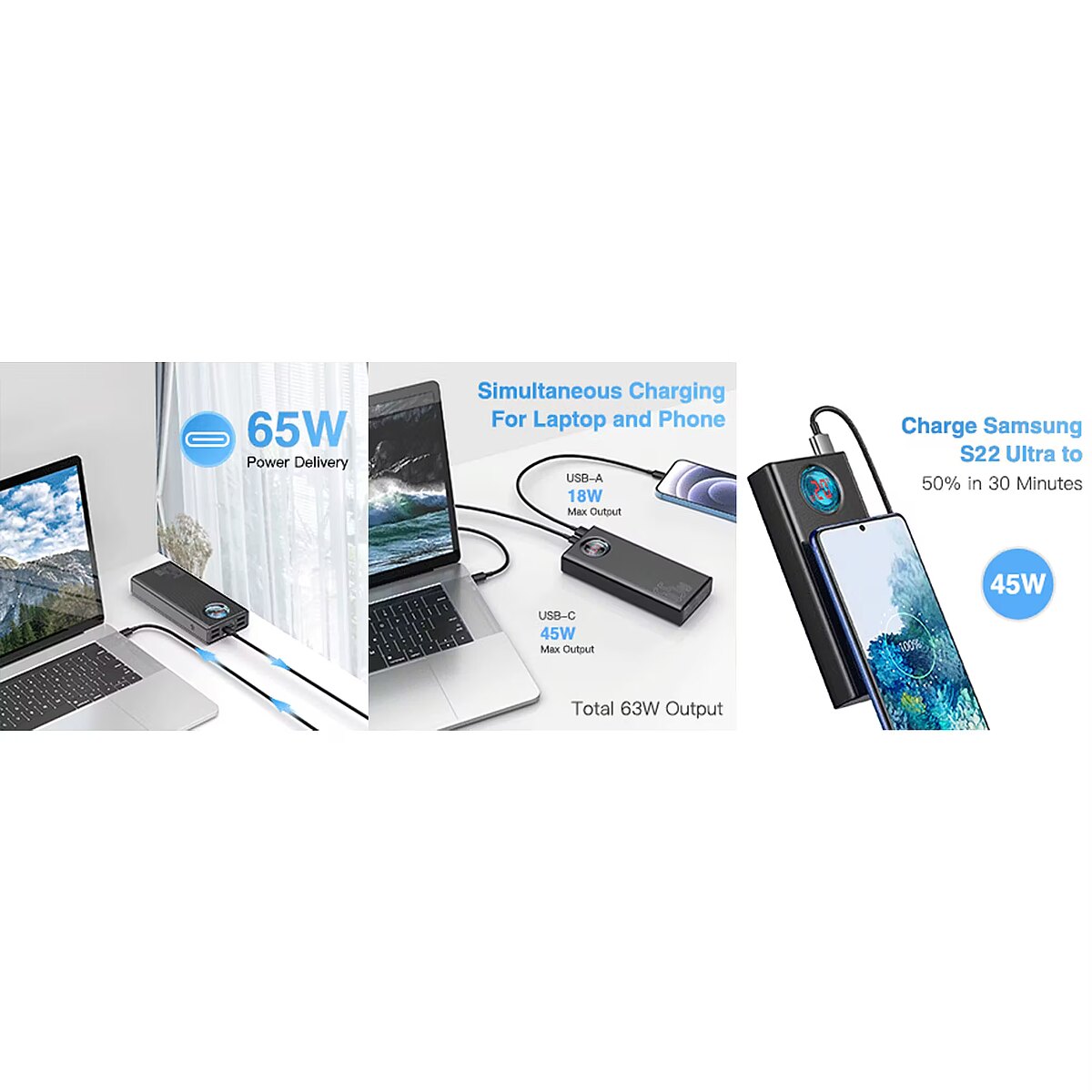 USB1 / USB2 / USB3 + USB-C: 15W + 45 W