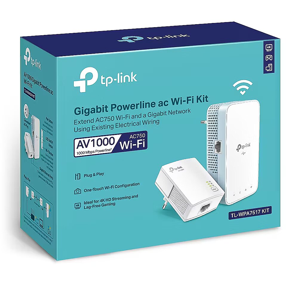 Description - TL-WPA7517 KIT AV1000 Gigabit Powerline ac Wi-Fi Kit Homeplug AV2 standard compliant - Provides users with stable, high-speed data transfer rates of up to 1000 Mbps on a line length of up to 300 meters Dual band 802.11ac Wi-Fi - AC750 dual band Wi-Fi (433Mbps on 5GHz & 300Mbps on 2.4GHz) allows streaming, gaming, emailing, browsing and posting on your wireless devices, throughout your home Wi-Fi Auto-Sync - Simply copy your router‘s Wi-Fi settings and apply any changes across the secure powerline network with Wi-Fi Clone and Wi-Fi Move Gigabit Ethernet Port - Provide reliable high-speed wired connections for game consoles, smart TVs, and NAS Plug, Pair and Play - Quickly set up a secured Powerline network