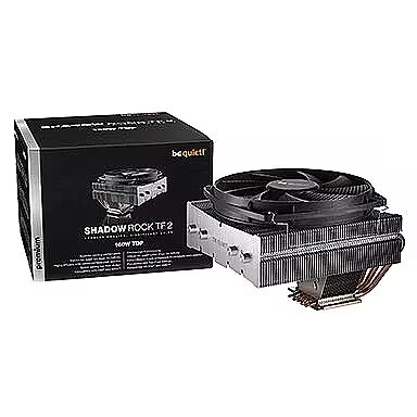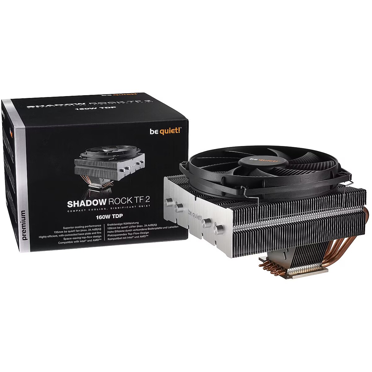 LongDesc - SHADOW ROCK TF 2Compact Cooling, Significantly QuietShadow Rock TF 2 is the perfect cooler for PC systems with restricted space. It offers the best mix of performance and price in the premium compact CPU cooler segment.HIGH-PERFORMANCE HEATPIPESOffering the system an impressive cooling performance Shadow Rock TF 2 is equipped with five 6mm heat pipes. They carry the heat straight to optimal locations on the cooling fins and provide the system with a remarkable compact cooling capacity of 160W TDP.DIRECT CONNECTION OF BASE PLATE AND FINS For highly effective cooling powerAn ingenious cooling concept: The baseplate and the cooling fins of Shadow Rock TF 2 are directly connected. This ensures fast heat transfer and optimum cooling efficiency.EXTREMELY SILENCE-OPTIMIZED OPERATIONEven at 100% fan speed the overall noise is merely 24.4dB(A)Silent operation typical for be quiet! products is achieved by the silence-optimized 135mm be quiet! fan. Delivering the best balance between cooling performance and quietness its smooth operation is thanks to the 9 airflow-optimized fan blades and durable rifle-bearing technology.SMALL, DIAGONALLY ARRANGED FINSProduce the perfect airflowThe small diagonal fins on the back of the cooler direct the airflow to guarantee efficient cooling for the CPU as well as components around the Intel® or AMD™ socket.SPACE-SAVING TOP-FLOW DESIGNBenefit from this highly functional conceptThe top-flow design is perfect for anyone who has to cope with limited space restrictions when building a system. Shadow Rock TF 2 more than solves this problem