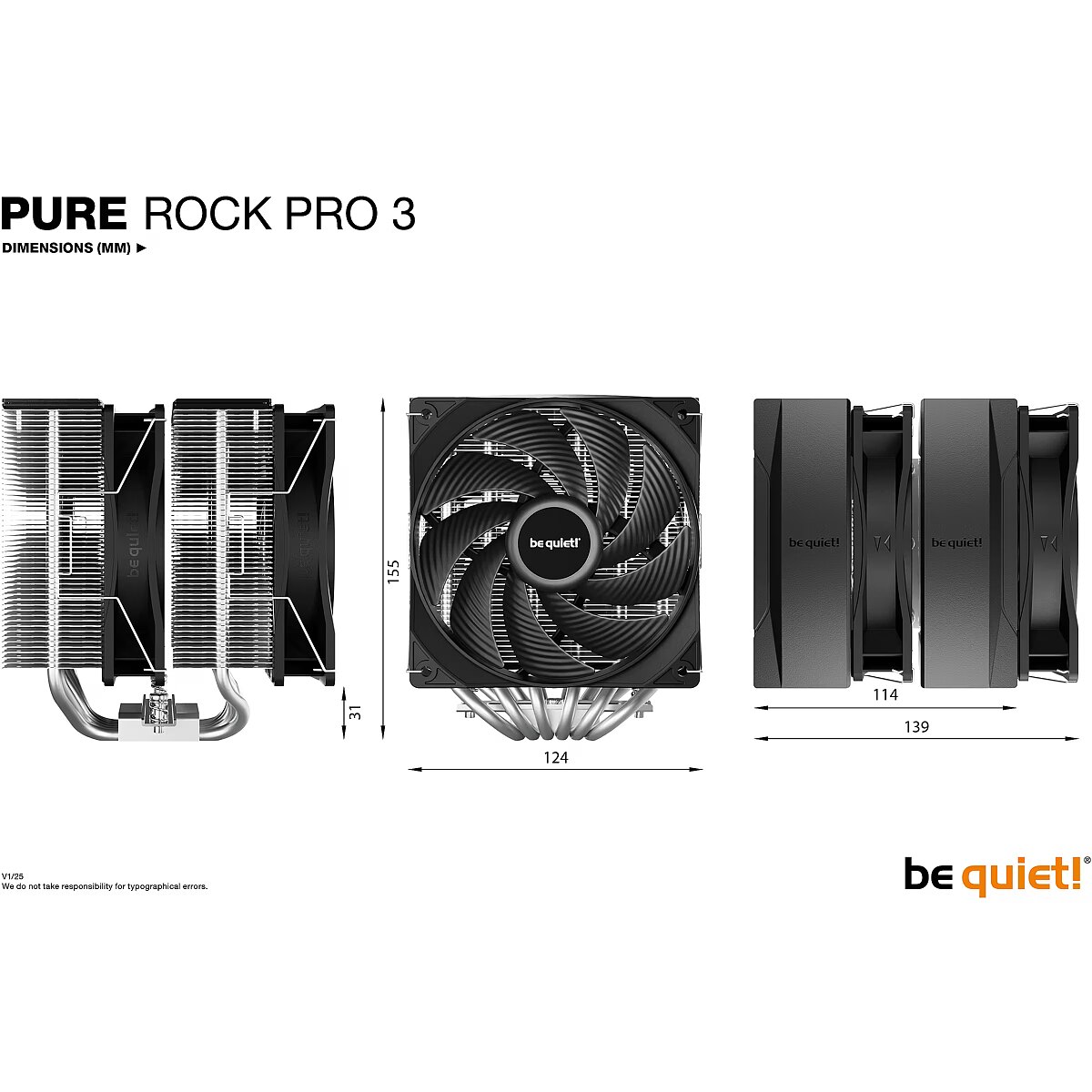 LongSummaryDescription - be quiet! Pure Rock Pro 3. Type: Air cooler, Fan diameter: 12 cm, Rotational speed (max): 2000 RPM, Airflow: 101.2 m³/h, Maximum air pressure: 2.41 mmH2O, Bearing type: Rifle bearing. Width: 124 mm, Depth: 139 mm, Height: 155 mm. Product colour: Silver