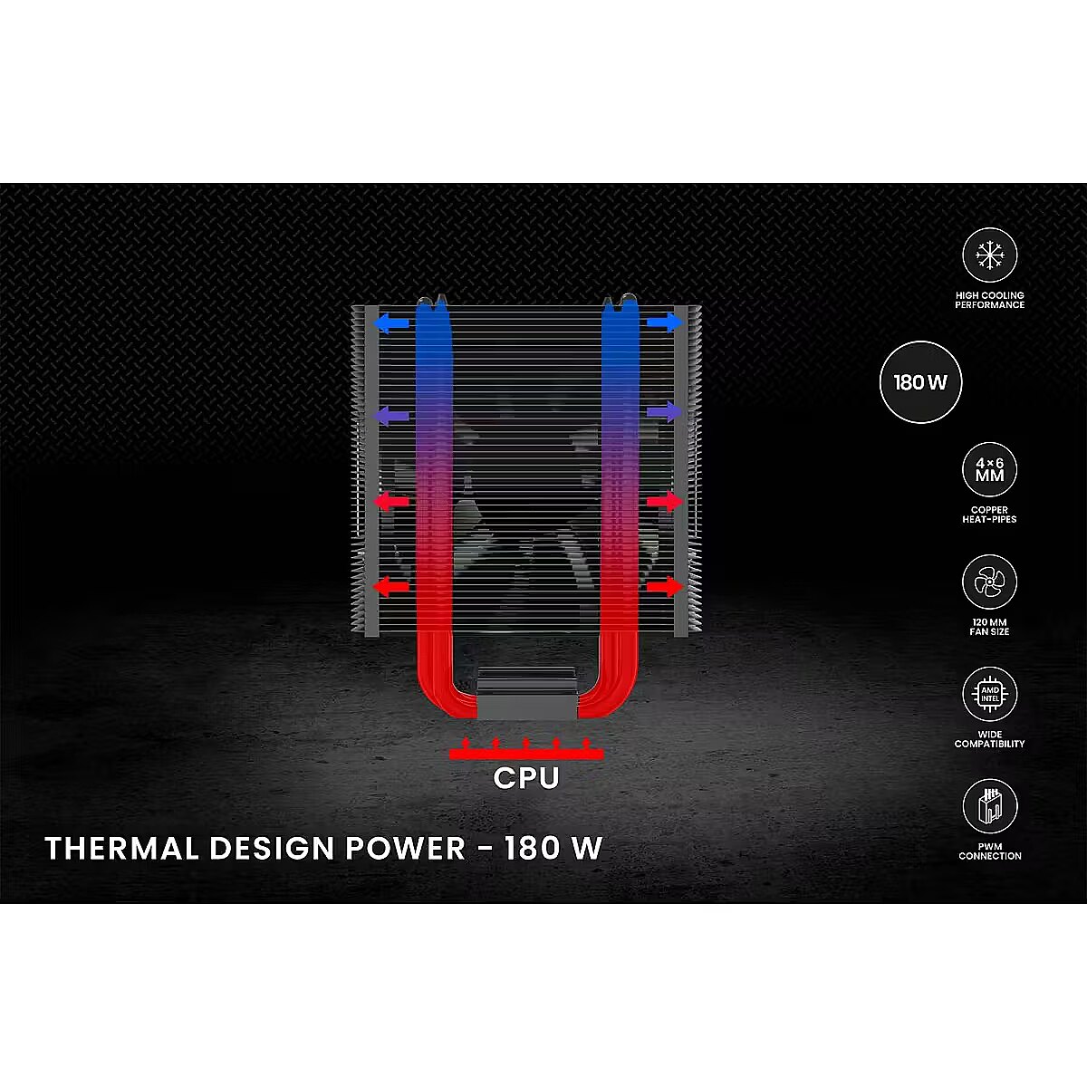 Description - VORTEX X2 BLACK CPU cooler When the game reaches its critical phase, your processor cant afford to give in. Thats why the VORTEX X2 BLACK was created a CPU cooler built for gamers who demand maximum performance and total control. With a modern design, solid construction, and uncompromising efficiency, this is hardware ready for the toughest challenges. High Cooling Performance Thanks to a precisely engineered heatsink and a powerful fan, the VORTEX X2 BLACK keeps temperatures under control even under maximum load. Designed for intensive gaming and demanding tasks, it effectively dissipates heat and protects your CPU from overheating delivering both stability and silence. TDP Rating 180 W With a TDP of 180 W, this cooler can handle even high-end processors. Feel free to overclock the VORTEX X2 Black wont slow down and wont let your system overheat. Copper Heatpipes Four high-performance copper heatpipes rapidly transfer heat from the CPU surface to the heatsink. The result? Fast and efficient cooling even during extreme gaming sessions. 120 mm Fan The 120 mm fan with a rotation range of 800-1800 RPM ensures optimal airflow while keeping noise levels low. Automatic speed control allows the system to work as needed quiet during idle, powerful during gameplay. Wide Compatibility Whether youre building on Intel or AMD, the VORTEX X2 BLACK supports the most popular sockets, including Intel LGA 1700, 1200, 2066, and AMD AM5, AM4, FM2+, and more. A universal solution that fits almost any build. Motherboard Sync Ready Thanks to the 4-pin PWM connector, the Vortex X2 Black works seamlessly with your motherboard, dynamically adjusting fan speed based on your systems needs. Ready to Go Out of the Box The package includes everything you need: heatsink, 120 mm fan, mounting accessories, thermal paste, and instructions. Install it, power it up, and youre ready for unlimited gaming.
