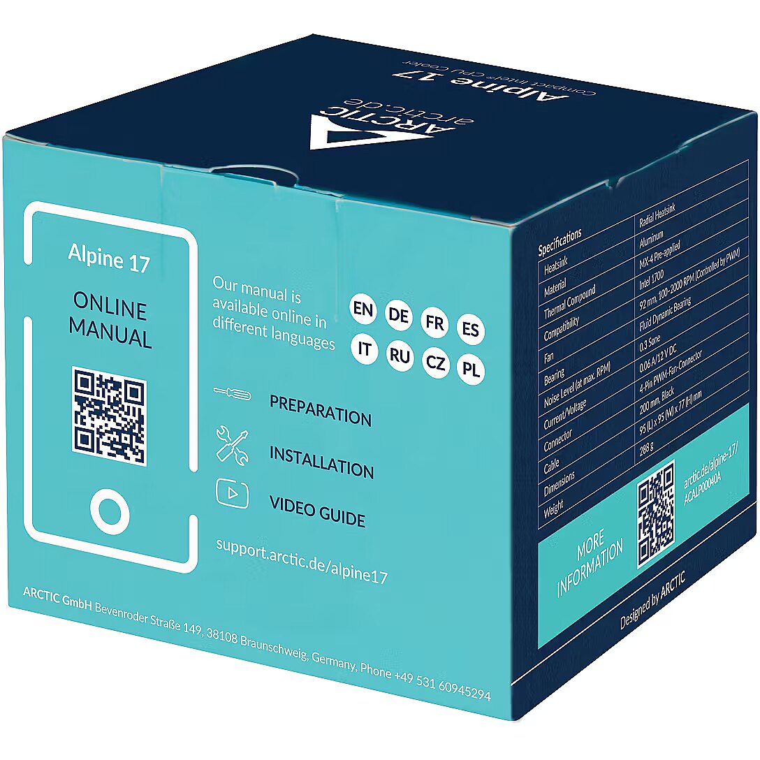 LargeDescHTML - DESIGNED FOR INTEL ALDER LAKEThe Alpine 17 is exclusively compatible with Socket LGA1700 and Intel's latest Alder Lake CPUs.FULL CONTROL WITH WIDE RPM RANGEThe Alpine 17 features a very wide PWM-controlled speed range. This reduces noise to the minimum while also guaranteeing the highest cooling performance.EASY AND TOOL-FREE INSTALLATIONWith the MX-4 already pre-applied, the Alpine 17 can be mounted directly. Thanks to the push pins, installation is a breeze. Additional tools are not needed to mount the cooler.HIGH-QUALITY BEARINGThanks to an alloy/lubricant combination developed in Germany, friction inside the bearing is reduced and higher efficiency is achieved. In this way, less heat develops, there is less bearing noise and the fan life is extended.IMPROVED COOLING PERFORMANCE THROUGH INNOVATIVE HEAT SINK DESIGNThe extra fine cooling fins of the new Alpine are fanned out in a Y-shape. The high thermal conductivity of the aluminum is fully retained in the type of extrusion used. This novel production process makes it possible to produce a high-performance yet very compact radial heat sink. This results in an increase in the surface area of the heat sink, optimization of the airflow and thus an increase in cooling performance.