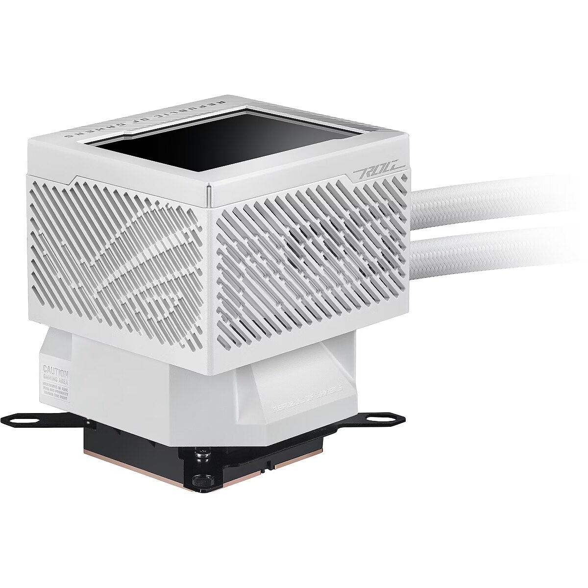 LongDesc - COOLER THAN COOLGo cooler than cool with the Ryujin III White Edition. Its pristine frame houses an expansive 3.5-inch LCD screen that displays live system stats, animated GIFs, or even your own custom artwork. Underneath, a new 8th Gen Asetek pump quietly keeps the latest processors from Intel and AMD cool, while an embedded Axial-tech fan helps control motherboard VRM temps. And the coolant within flows through 400mm of reinforced tubing and a higher capacity radiator chilled by two magnetic ROG 120 mm ARGB fans, making installation and customization a snap.Magnetic Daisy-Chainable FansThe customizable ARGB fans snap together with a magnetic connector that links the fans and transmits control signals and power. Only one cable is required for all two fans, making installation and cable management a breeze.Full Color3.5” LCD DisplayInternal memory has also been doubled to support clearer default animations and longer videos.Full Color 3.5” LCD DisplaySystem MonitoringThe industry-leading 3.5-inch LCD built into the pump block delivers instant monitoring of clock frequencies, voltages, temperatures, fan speeds and water flow, or your custom GIFs.Full Color 3.5” LCD DisplayPersonalized AnimationChoose a pre-designed animation from the ROG gallery, or easily add one of your own.Full Color 3.5” LCD DisplayCustom WallpaperDo you prefer banners or clan logos? Choose one designed by ROG, or put your own text or JPEG file on proud display at the heart of your rig.Cool UpgradesNew Cold PlateThe contact surface is now 32% larger to keep the chill on power hungry processors.Enhanced TubingThe sleeved rubber is wrapped in braided mesh, and the inner diameter has been enlarged from 5 mm to 7 mm to reduce flow resistance.Thicker Radiator279.5 x 120 x 30 mm radiator — 3mm thicker than previous gen, for improved cooling performance.Embedded VRM FanA larger embedded Axial-tech fan improves airflow, reducing motherboard VRM temperatures by up to 35 Celsius.Software PersonalizationFan ControlThis generation of ROG all-in-one coolers now includes software that lets you control the speeds of your pump and embedded fan, in a way that should be instantly recognizable to FanXpert veterans.AIDA64 ExtremeThe ROG Ryujin III ARGB also comes with a one-year subscription to AIDA 64 Extreme, whose data can be fed live onto the cooler’s LCD screen to get even more info on the state of your system.EXTENSIVE COMPATIBILITYThe ROG Ryujin III series features 400 mm of tubing and is compatible with a wide range of Intel® and AMD motherboard platforms, giving you ample processor and build flexibility.