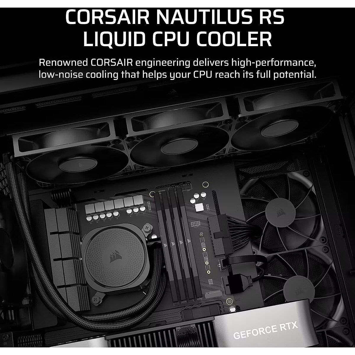 Description - The CORSAIR NAUTILUS RS Liquid CPU Cooler showcases CORSAIR's engineering and design excellence, offering powerful, quiet cooling with simple connectivity - no controller required, simply connect directly to your motherboard. Its slightly domed cold plate with pre-applied thermal paste provides excellent heat transfer, while the RS120 fans keep temperatures low for maximum CPU performance. Simplify your build with easy, daisy-chain connections and precise cooling control with the 4-pin PWM fan connector. For more advanced control, you can use the optional iCUE controller and adapter cable (sold separately). Supporting a wide range of Intel and AMD CPU sockets, including LGA 1851, the NAUTILUS RS offers broad system compatibility.