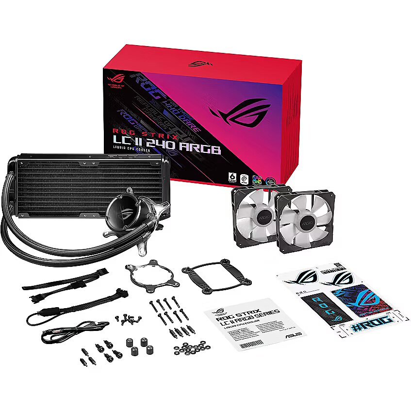 LongDesc - ROG STRIX LC II 240 ARGBROG Strix LC II 240 ARGB AIO delivers high-performance CPU liquid cooling with sleek, modern aesthetics. Featuring a closed-loop design and ARGB radiator fans, the cooler unleashes the full potential of an Intel or AMD CPU while further accentuating your build with brilliant multi-color lighting effects. With the cooling you expect from ROG, Strix LC II 240 ARGB is ready to become an essential part of your rig and light it up with your own unique style.NEXT-LEVEL CUSTOMIZATIONEmanate Your StyleIntricate new designs on ROG Strix LC II 240 ARGB showcase the iconic ROG aesthetic, and every detail shines with the spirit of Strix. Aura Sync support on the pump cover’s new illuminated ROG logo and ARGB radiator fans allows you to coordinate lighting effects with ROG build components — and show off your personal style. Also, engraved ROG lettering on the radiator’s side complements the iridescent lettering on the hubs of each fan.COMPREHENSIVE COMPATIBILITYROG Strix LC II series is compatible with a wide range of Intel® and AMD motherboard platforms, giving you the flexibility to pair it with your choice of processor. With 380mm of tubing at your disposal, radiator installation is equally as flexible in a variety of chassis.