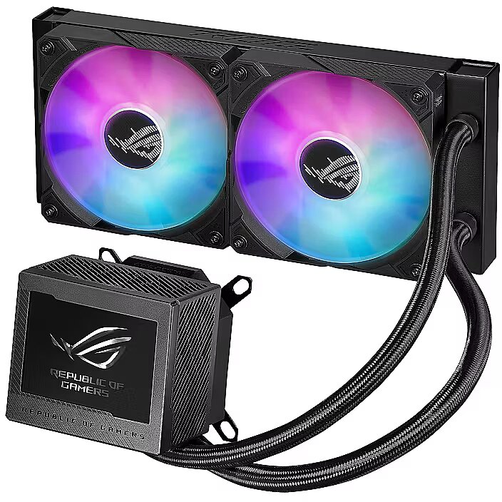 ROG Ryujin III 240 ARGB AIO CPU liquid cooling system with 3.5 LCD display, Asetek 8th generation pump, integrated pump fan and two ROG 120mm ARGB heatsink fans that can be daisy chained together. The 3.5 LCD screen allows quick check of component information and displays personalised animations in GIF format now offering twice the data memory The latest Asetek 8th generation pump with three-phase motor provides superior cooling performance, higher flow rate and lower impedance, as well as noise reduction Built-in fan distinguished by a new ring-shaped frame and advanced airflow channels improves temperature reduction around the VRM system Magnetically attached daisy chaining premium ROG ARGB fans with Gen 2 LEDs allows users to personalise lighting effects Armoury Crate software offers full control over the speed of the pump, the built-in fan and the heatsink fan, in addition to displaying personalised animations and system performance data on the LCD screen. Users also receive a free one-year licence of AIDA 64 software for advanced system monitoring