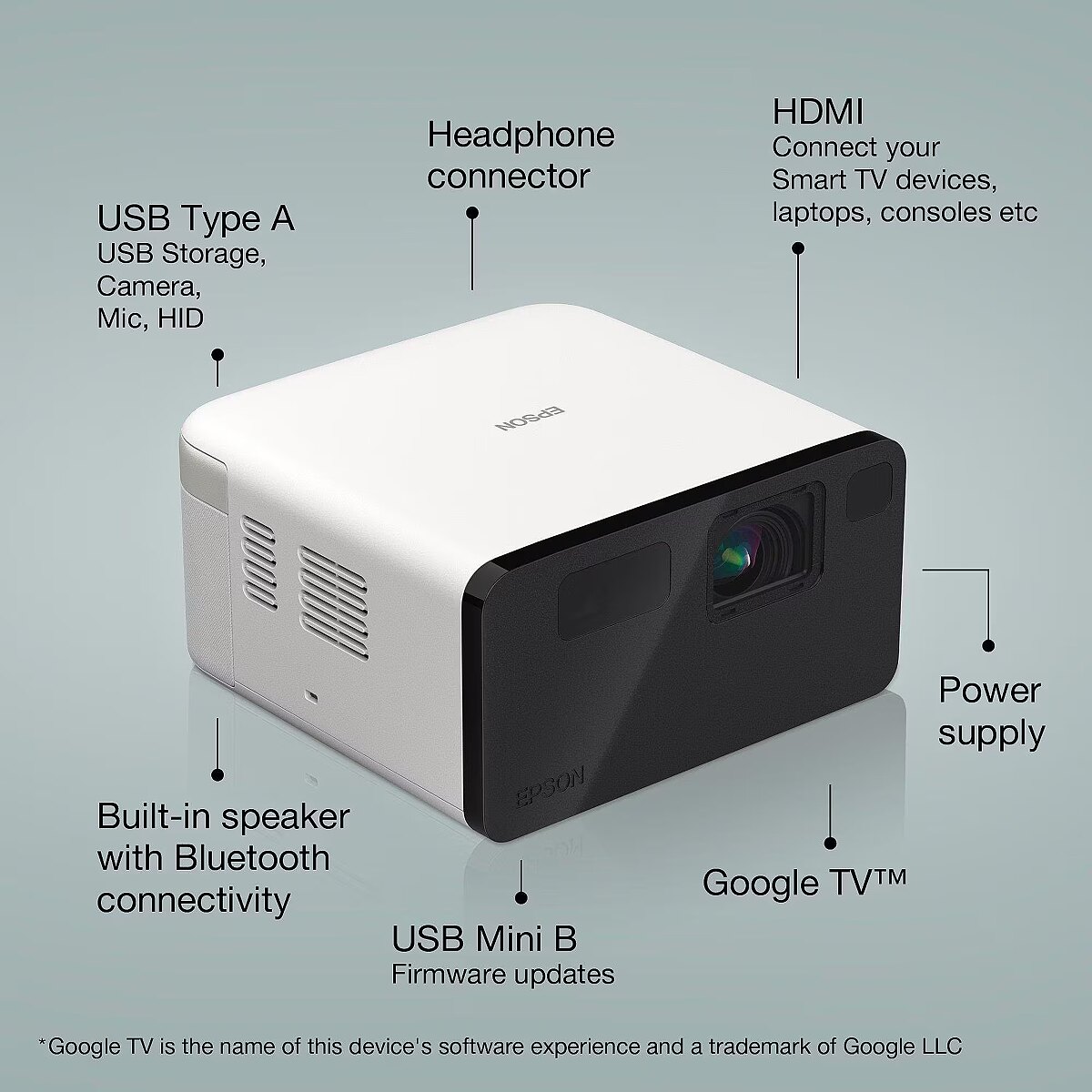 LongDesc - The EF-21W is stylish and compact with a screen size of up to 150 inchesMini smart laser projection TV Even when the projector is placed close to the wall, supersize your favourite films, games and sporting events at home with a screen size of up to 150"Smart home entertainment See 400,000+* movies and TV episodes all in one place. Google TV brings your favourite content from across your apps and subscriptions and organises them just for youLong-lasting solution With this model's long-lasting laser light source, you'll be able to enjoy entertainment for up to 10 years*Superior picture quality Images appear more vivid and bright with Epson's 3LCD technology, up to three times brighter colours than comparable 1-chip DLP projectors*Refreshingly easy to use Plug in, turn on, link up and play. Access instant entertainment at home or on the go.Legal StatementComplies with The UK Product Security and Telecommunications Infrastructure (Product Security) requirements. Epson will provide security updates until 31/07/29 from purchase.Stylish, mini laser projectorThis compact projector comes in warm white and can be projected in any direction - on a wall, ceiling or floor. The simple usability, setup and portability means you can enjoy entertainment on the go.Bigger is betterCreate the big screen experience wherever you want with an impressive display of up to 150 inches. With Epson's equally high White and Colour Light Output images are clear, sharp and content is brought to life.Smart home entertainmentEverything you stream. All on one screen. Access 400,000+* movies and TV episodes, all in one place. Google TV™ brings your favourite content from across your apps and subscriptions and organizes them just for you. Ask Google Assistant to find movies, stream apps, play music and control your projector - all with your voice*. Easily cast movies, shows, photos, and more from your phone or tablet, right to your projector with Google Cast*. The built-in 5W Bluetooth speakers can be used with or without a visual display.Long-lasting solutionThe long-lasting laser light source will provide lower energy consumption, and you'll be able to enjoy home entertainment for up to 10 years*.High-quality, sharp imagesThis powerful yet affordable mini laser projector delivers exceptionally bright yet colourful images with clear details. It's 5,000,000:1 contrast ratio also produces clearly defined shadows and deep blacks. Epson's 3LCD technology means it's projectors have up to three times brighter colours than comparable 1-chip DLP projectors*.Simple set up - plug and playIncluded technologies such as automatic focus, keystone correction, obstacle avoidance and screen fit mean you enjoy instant entertainment at home or on the go. Simply power on the projector and let it find the best suitable screen size to fit your surroundings.