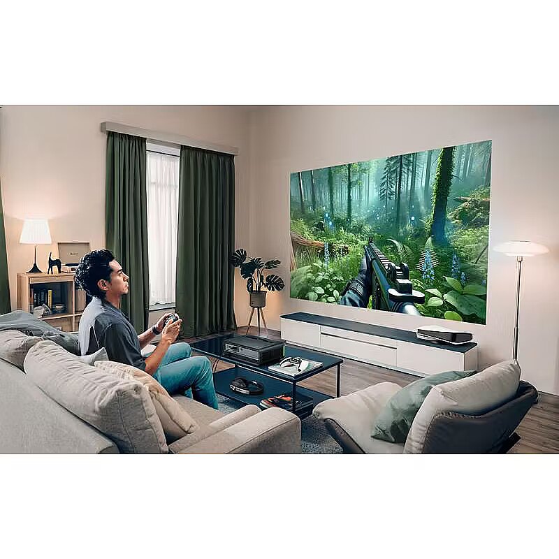 LongDesc - Experience gaming like never before with the ViewSonic X2-4KE Pro. This "Designed for Xbox" projector delivers stunning 1440p resolution at a 120Hz refresh rate on a 100+ inch screen, transforming gaming sessions into a larger-than-life experience. It also elevates home entertainment with built-in Google TV and a native Netflix app for seamless streaming, harmonizing 4K HDR visuals with cinematic audio from Harman Kardon speakers for an enthralling audiovisual experience. Advanced 3rd generation LED technology ensures brilliant image quality with 3,300 LED lumens of brightness, vibrant colors covering 125% of the Rec. 709 spectrum, and a high contrast ratio from a 0.65” DMD chip. With a 0.69-0.83 short throw ratio, the projector allows for a 100" display from just 1.5 meters away. Easy installation features include vertical lens shift, 1.2x optical zoom, and H/V keystone with 4-corner adjustment for side projection. HDMI eARC and Dolby/DTS support enhance surround sound for an immersive, cinema-like experience.​​