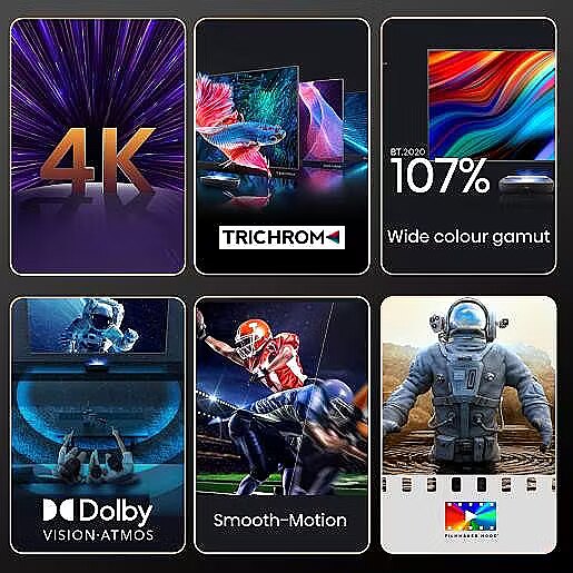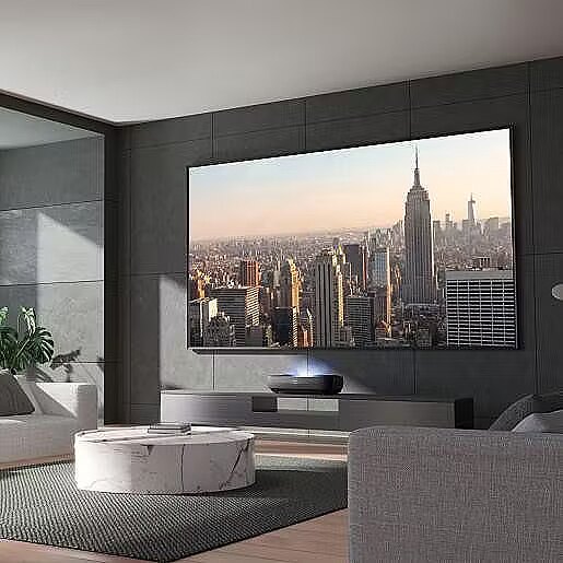 Telewizor laserowy Trichroma o ultra krótkim skoku wyświetla kolorowy i jasny obraz 4K na 100-calowym ekranie z odrzuceniem światła otoczenia, przeznaczonym do oglądania w dowolnym pomieszczeniu w domu. Obraz jest jasny i szczegółowy we wszystkich rodzajach oświetlenia, pozwalając cieszyć się doskonałym doświadczeniem oglądania dużego telewizora w różnych warunkach pokojowych.
