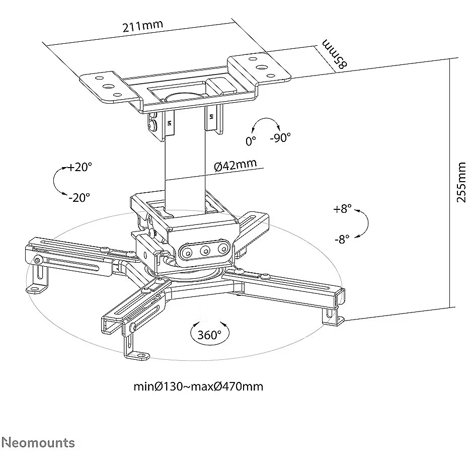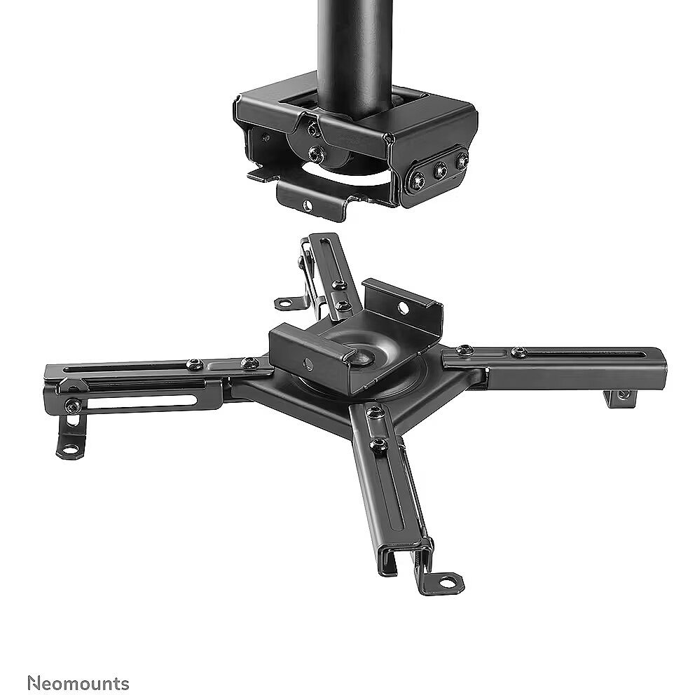 Description - Projector ceiling mount CL25-530BL1 The Neomounts CL25-530BL1 is a universal ceiling mount for a projector. Due to its high load capacity of up to 45 kg and various adjustment options, this projector ceiling mount has a wide range of applications. The CL25-530BL1 has four extendable arms and universal tilt (+20°, -20°), rotation (360°) and swivel (+8°, -8°) technology, ensuring optimum projection placement on any canvas, screen or wall.