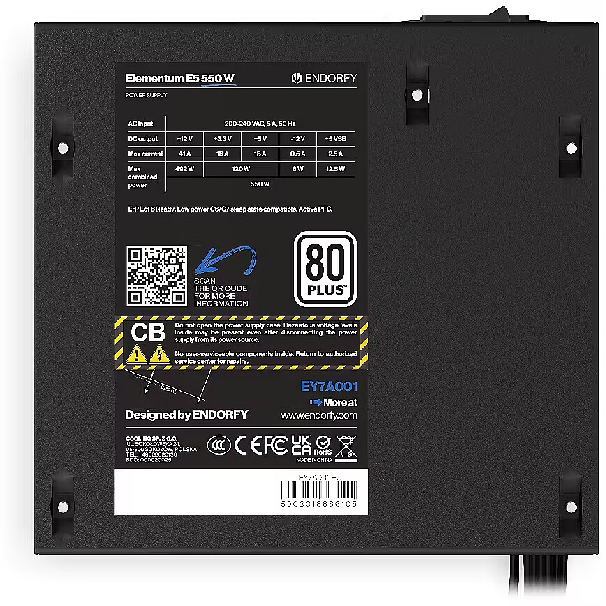 Для покупки доступен источник питания, произведенный Endorfy с выходной мощностью 550W. Продукту был присвоен сертификат энергоэффективности 80 PLUS (White).