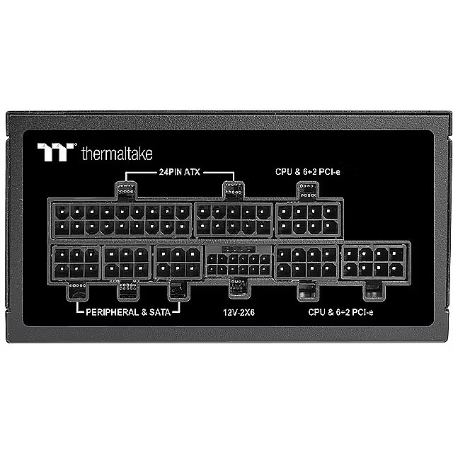 Этот блок питания марки Thermaltake имеет сертификат энергоэффективности 80 PLUS Platinum и выходную мощность 750W.