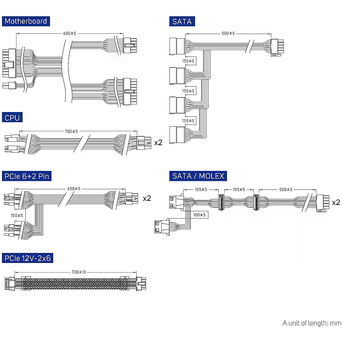 Packaging content - Cables included - CPU, Peripheral (Molex), SATA