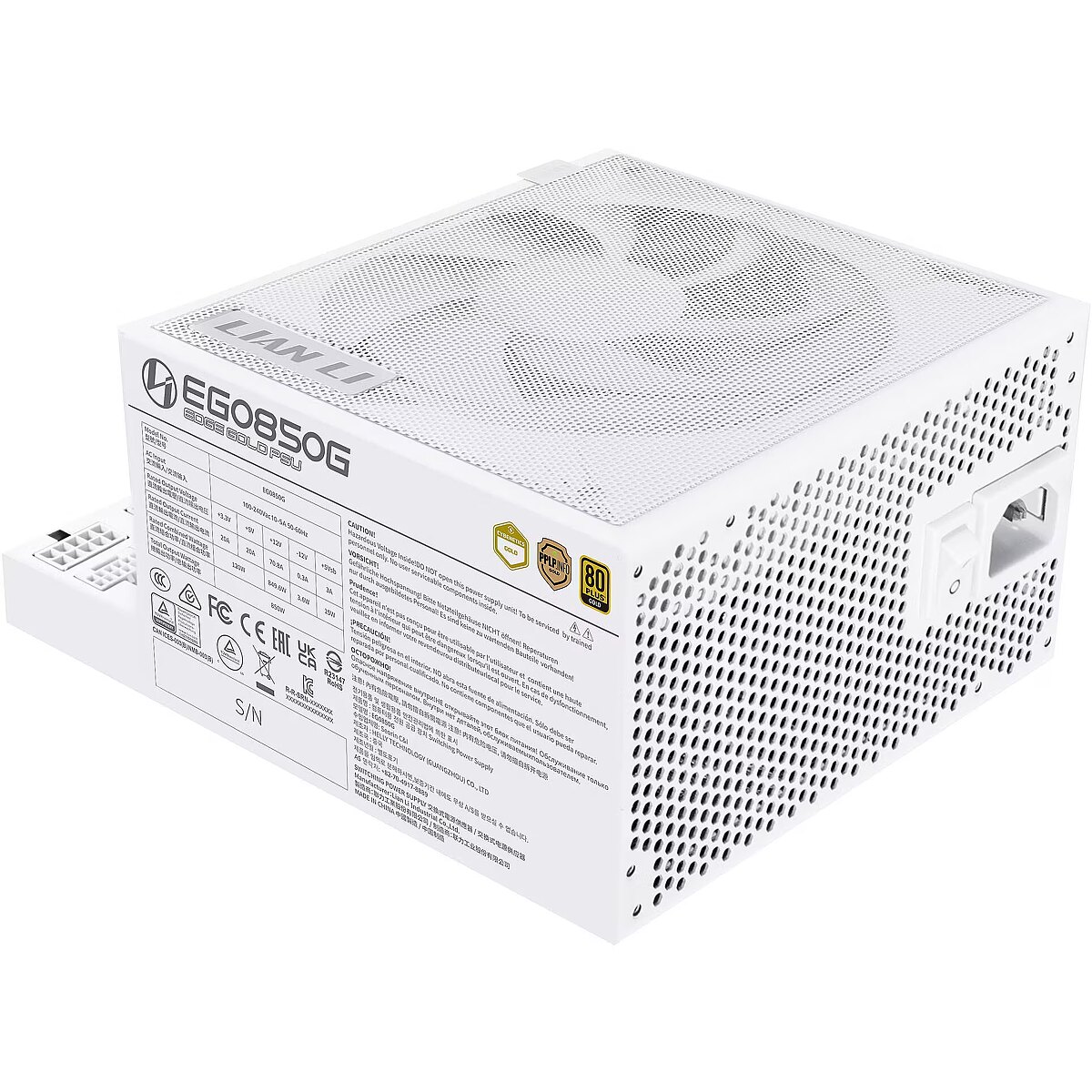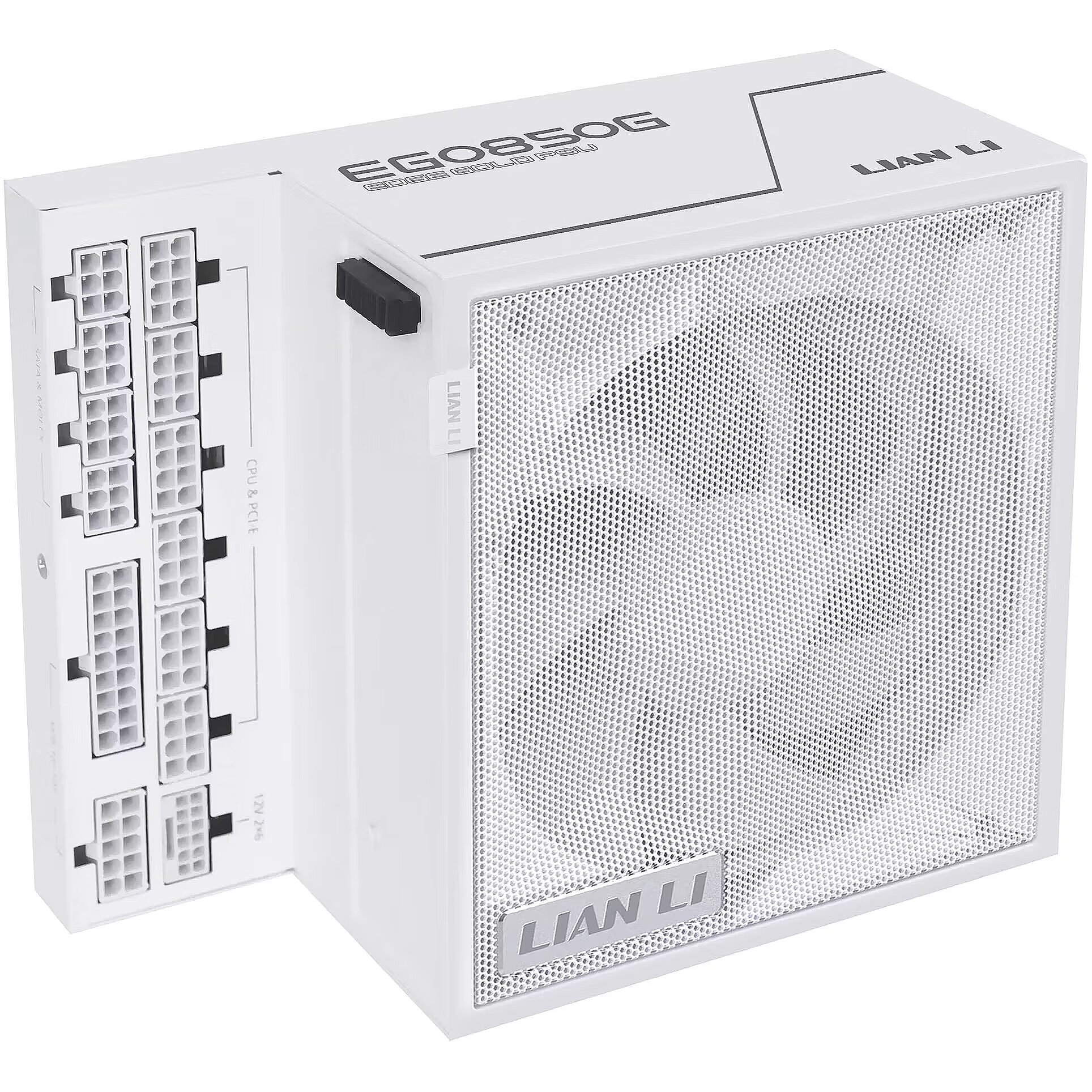 Summary - Lian Li EG0850G. Total power: 850 W, AC input voltage: 100 - 240 V, AC input frequency: 50/60 Hz. Motherboard power connector: 20+4 pin ATX, Motherboard power cable length: 50 cm, SATA power cable length: 300,400 mm. Purpose: PC, Power supply unit (PSU) form factor: ATX, 80 PLUS certification: 80 PLUS Platinum. Product colour: White, Cooling type: Active, Fan diameter: 12 cm. Cables included: CPU, PCIe, Peripheral (Molex), SATA