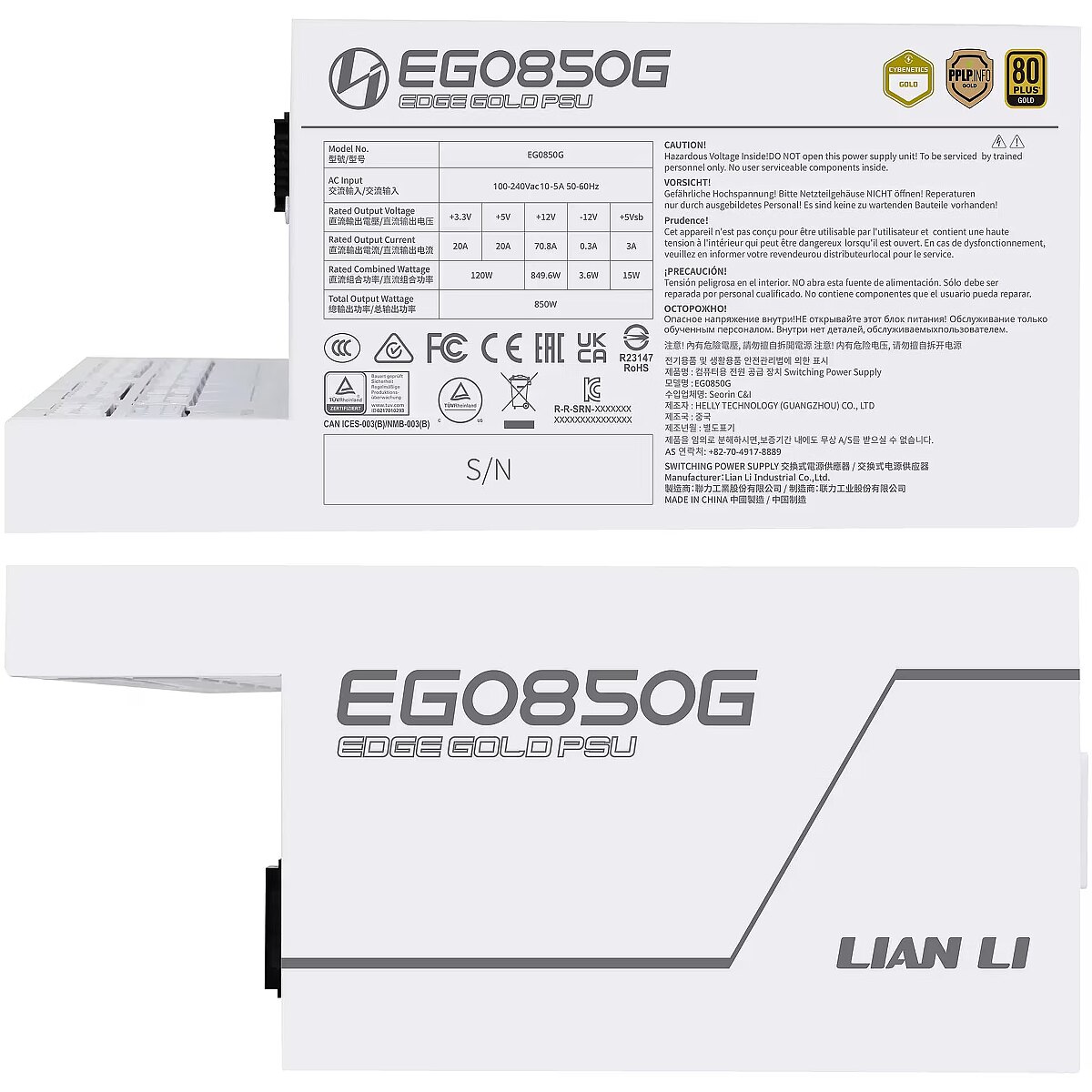 Connect the hub to a PCIe 8-PIN cable for independent operation. MAGNETIC DUST FILTER The magnetic mesh dust filter on top of the fan can be easily removed for regular cleaning, ensuring dust-free operation. A high porosity of 66.9% ensures ample ventilation and airflow with quiet fan operation, extending the PSU’s lifespan and reliability. CONVENIENT CABLE MANAGEMENT Engineered specifically for dual-chamber chassis such as the LIAN LI O11 series, the EDGE Gold PSU’s L-shape design is ideal for vertical installation in the second chamber. This outward-facing interface is more user-friendly than traditional side-mounted designs, making cable management simple and accessible for both beginners and experienced builders. LONGER CABLE REACH FOR VERSATILE BUILDS The Edge Gold PSU features new cables that are even longer, making it ideal for dual-chamber or regular tower chassis, enhancing flexibility and ensuring optimal cable management for all kinds of builds with ease. EFFICIENCY LEVEL CERTIFIED Achieving the 80 PLUS Gold, Cybenetics Platinum and PPLP Gold certifications, the EDGE Series ensures top-tier energy efficiency, reducing power consumption and heat output while delivering reliable, stable performance. COOL IN SILENCE Designed for optimal performance, the open style mesh facilitates excellent heat dissipation for internal components. This feature is especially beneficial for the 120 MM PWM fan, which operates efficiently with minimal noise, ensuring the system stays cool and quiet even under heavy loads. STABLE DUAL COLOR PCIE5.1 CONNECTOR LIAN LI’s in-house R&D designed a high-quality 12V-2×6 dual-color connector featuring alloy copper soldered terminals for secure and efficient power delivery, enhancing system stability and performance. The terminal maintain a contact resistance below 1.5mΩ after 50 plug/pull cycles, compared to ordinary terminals at 2-3mΩ, enhancing the connector’s performance and long-term reliability. BRAIDED-TEXTURE SLEEVED CABLES FOR A CLEAN BUILD The PSU comes equipped with all cables featuring a braided texture. The 20+4pin, CPU, PCIe 6+2pin, and 12V-2×6 cables are designed with easy-to-adjust cable combs, ensuring very clean curves and cable runs for an aesthetically pleasing and organized dual chamber build. INDUSTRIAL GRADE CAPACITORS The EDGE Gold PSU integrates the German EPCOS capacitors or same level Japanese capacitors, offering compact, robust performance with higher tolerances to harsh temperatures and environments. COMPREHENSIVE CONNECTORS The modular cables have a new longer design compared to the previous EDGE PSU, which ensures easy component reach and efficient cable management. SUFFICIENT PROTECTION Features OCP (Over Current Protection), OVP (Over Voltage Protection), SCP (Short Circuit Protection), OPP (Over Power Protection), UVP (Under Voltage Protection), OTP (Over Temperature Protection), SIP (Surge Intensity of election flow Protection), NLO (No Load Operation), and an Inrush Current Limiter that ensures the EDGE GOLD delivers continuously stable and reliable power.L-Shape design for dual chamber case80 PLUS Platinum EfficiencyBuilt-in USB expantion hub with 4 internal USB 2.0 headersIntegrating German EPCOS bulk capacitorsIn-house R&D 12V-2×6 alloy copper soldered terminalsATX 3.0/3.1 compliant PSUFull modular sleeved cable with cable comb MB/CPU/GPU connectors