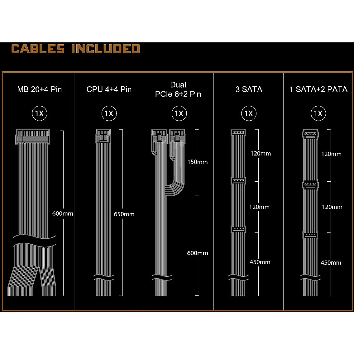 Блок питания не имеет модульных кабелей; все кабели присоединены к блоку питания и не съемные. Несмотря на это, он будет работать так же хорошо, как блок питания с модульными кабелями.