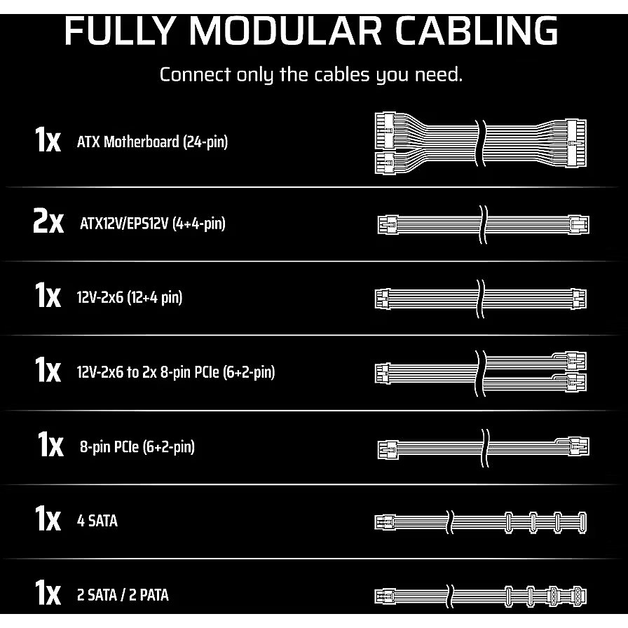 Этот блок питания имеет полностью модульные кабели (Fully-modular) – вы можете подключать и отключать все включенные кабели по мере необходимости, уменьшая беспорядок и улучшая вентиляцию. Это будет полезно для тех, у кого частично прозрачный корпус компьютера и для кого