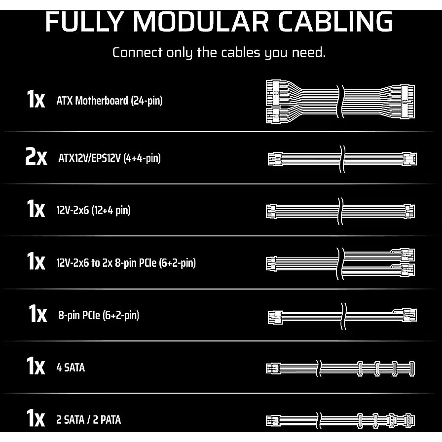 Этот блок питания имеет модульные кабели, что предоставляет возможность добавлять кабели для видеокарты, жесткого диска и т. д. по мере необходимости из поставляемого диапазона. Таким образом, беспорядок проводов в компьютере уменьшается, улучшая вентиляцию и эстетический фактор (особенно важно для тех, кто приобретает частично прозрачный корпус).