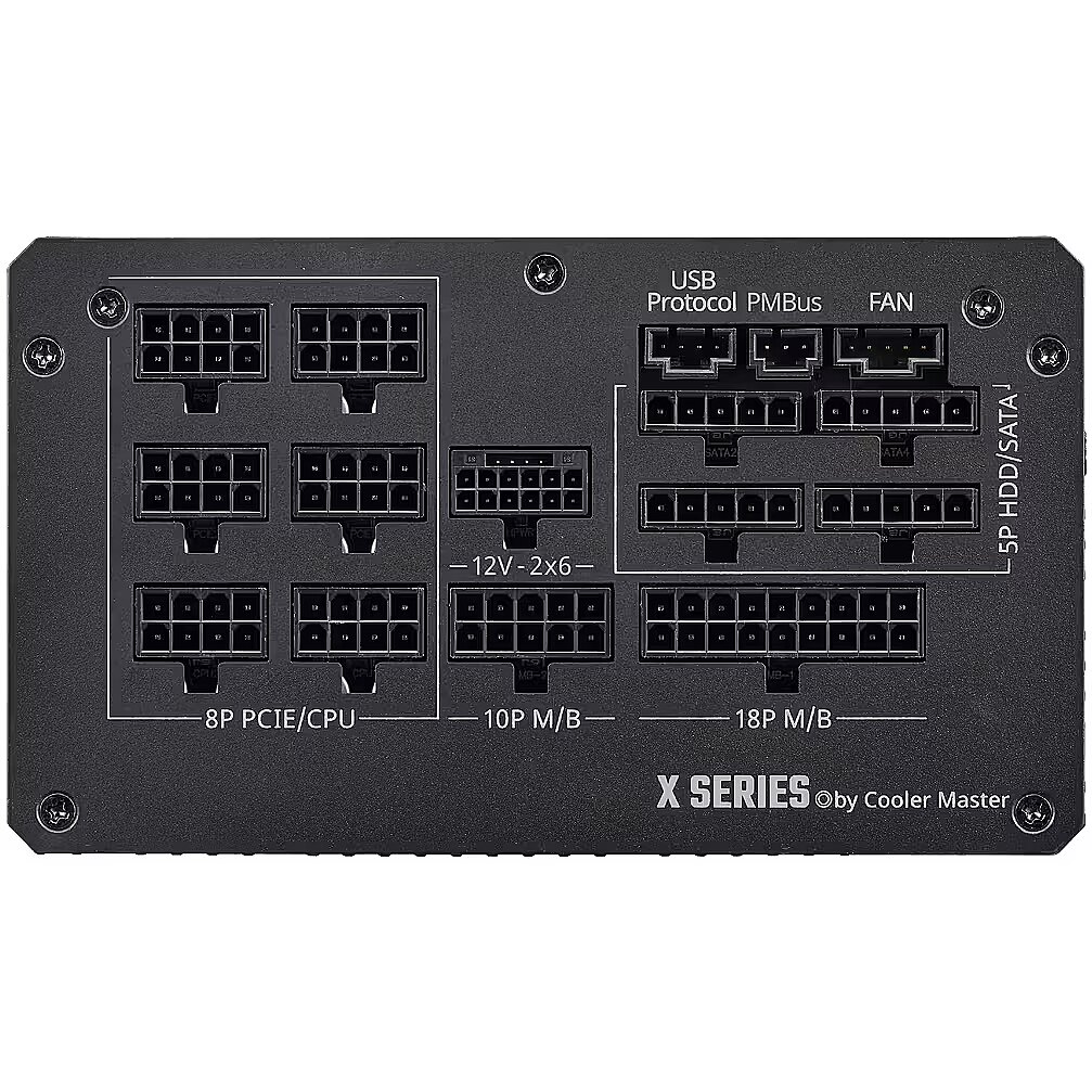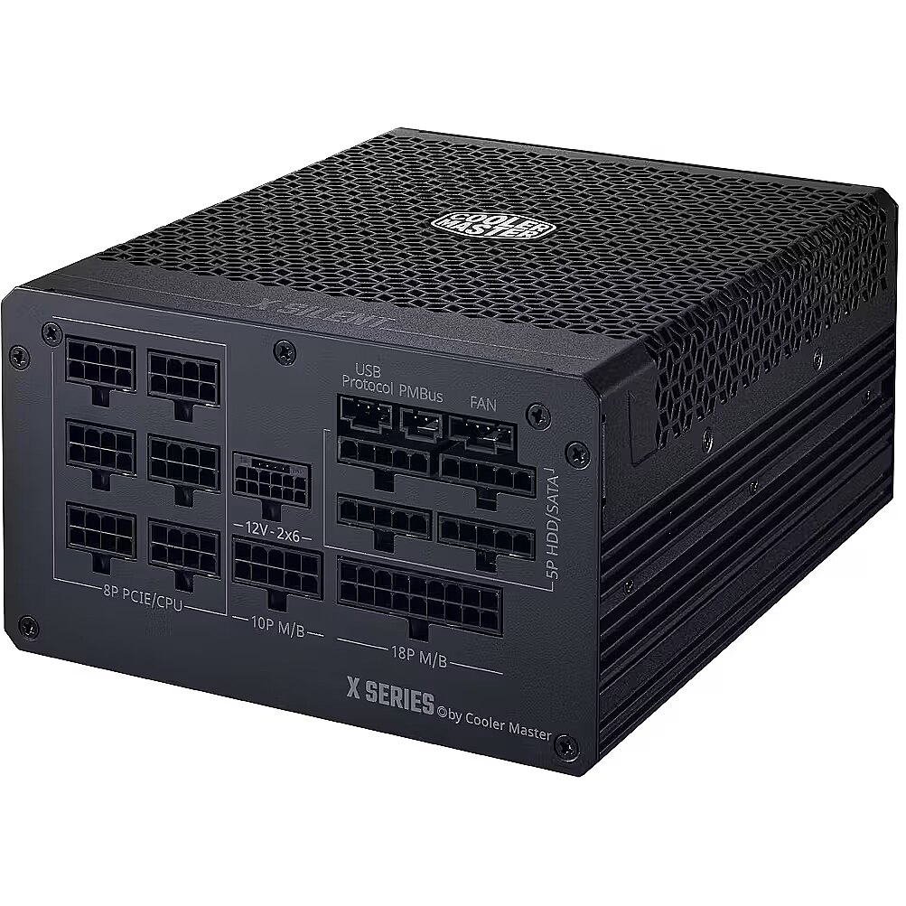 Этот блок питания марки Cooler Master имеет сертификат энергоэффективности 80 PLUS Platinum и выходную мощность 1100W.