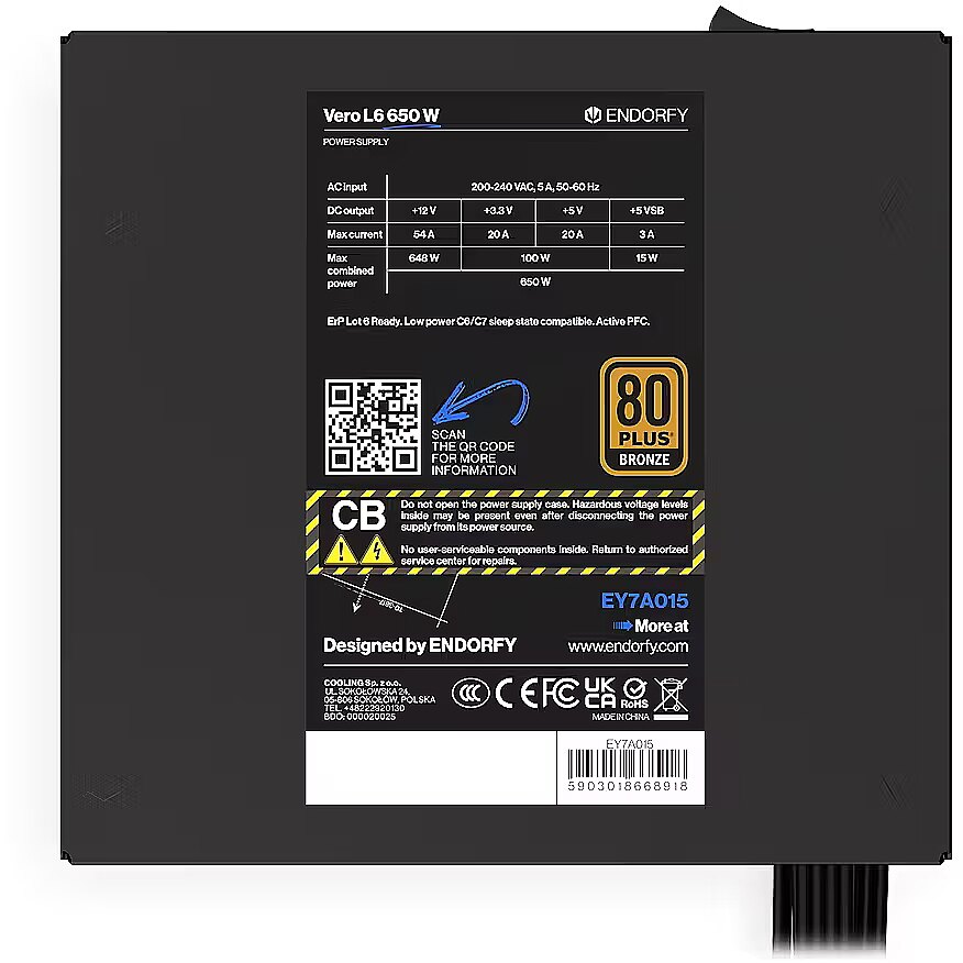 Мы предлагаем приобрести блок питания Endorfy с мощностью 650W, который получил сертификат энергоэффективности 80 PLUS Bronze.
