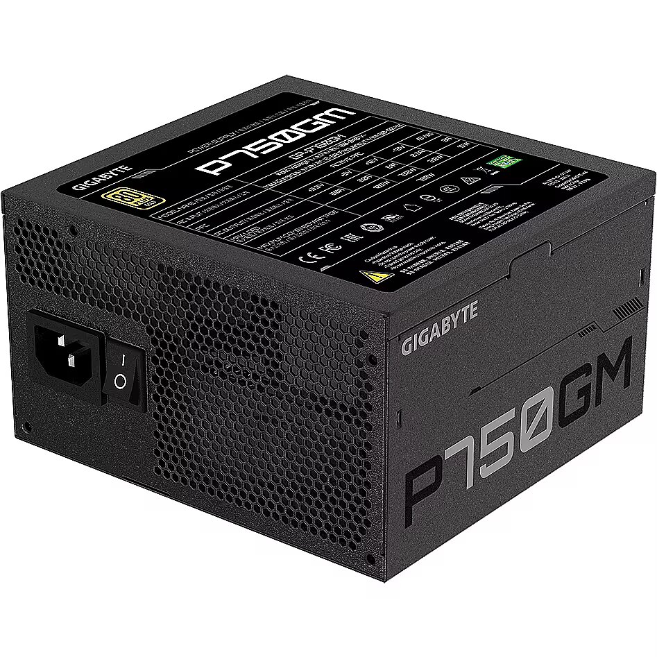 Summary - GIGABYTE P750GM. Total power: 750 W, AC input voltage: 100 - 240 V, AC input frequency: 50 - 60 Hz. Motherboard power connector: 20+4 pin ATX, Motherboard power cable length: 61 cm, SATA power cable length: 150,600 mm. Purpose: PC, Power supply unit (PSU) form factor: ATX, 80 PLUS certification: 80 PLUS Gold. Product colour: Black, Cooling type: Active, Fan diameter: 12 cm. Cables included: CPU, PCIe, Peripheral (Molex), SATA