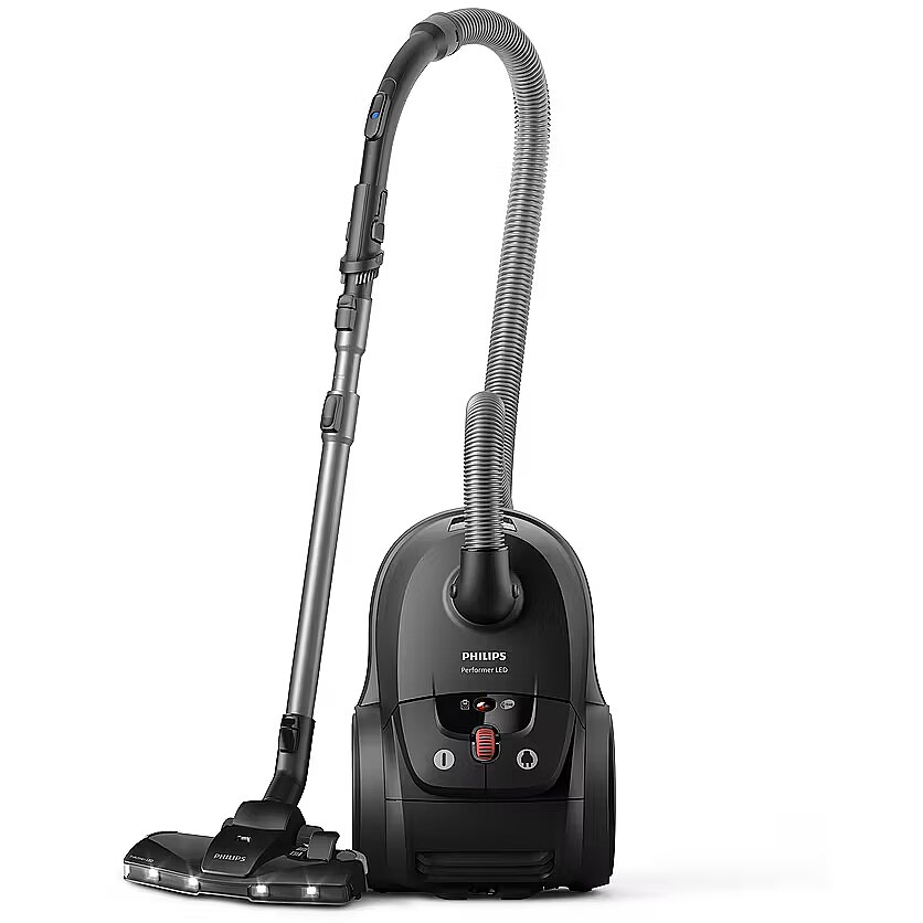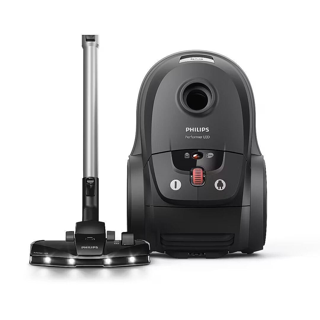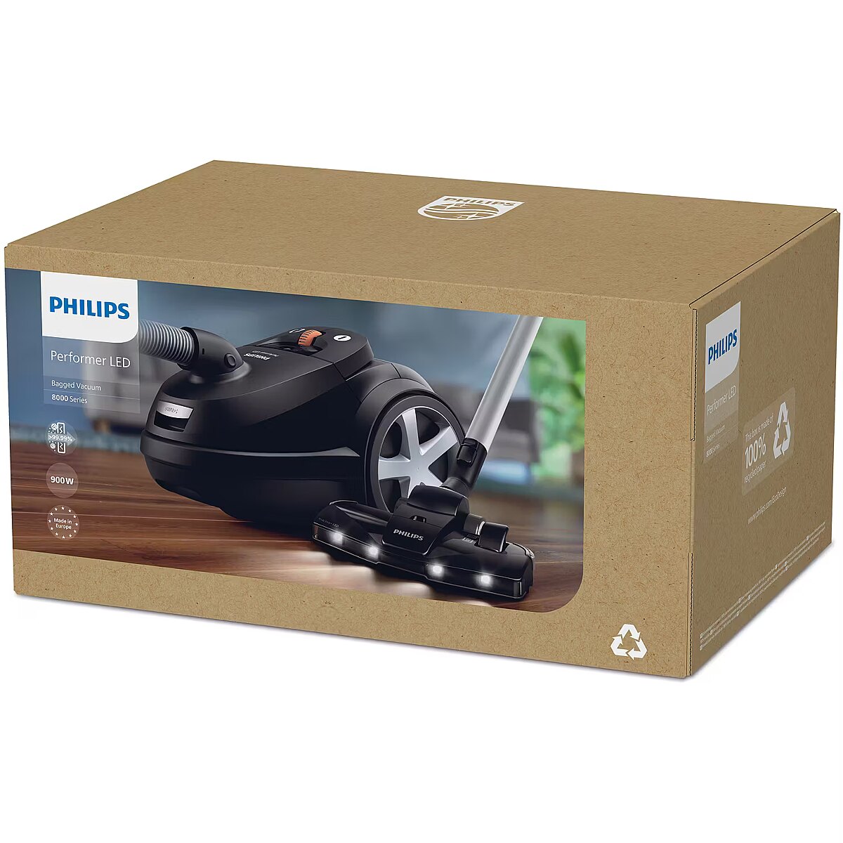 Description - Performer LED 8000 Series Vacuum cleaner with bag The most powerful of Philips bagged vacuum cleaners. With the Philips Performer LED 8000 series bagged vacuum cleaner, your floors will be cleaner than ever before. The TriActive+ LED nozzle with innovative floor light technology helps you find the smallest dust particles, and with a 900 W motor power, they will be sucked up in no time. 900 W, collects 99.9% of dust TriActive+ LED nozzle HEPA 13 filtration level