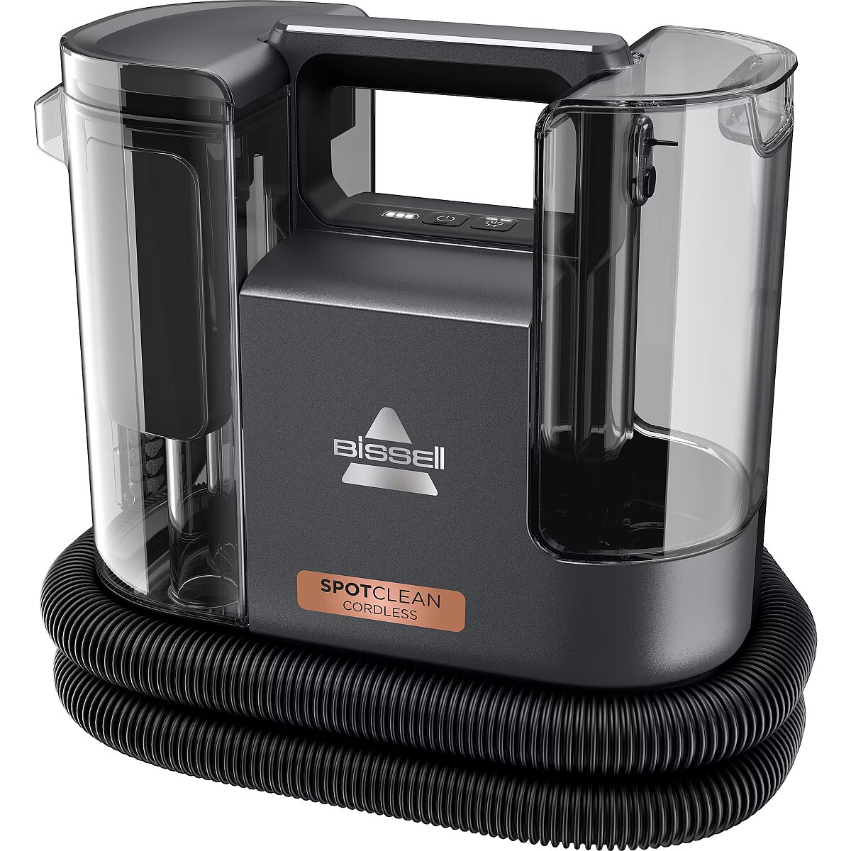 LongDesc - BISSELL® SpotClean® Cordless portable carpet and upholstery deep cleaner combines cordless cleaning freedom with the power of a corded machine. Spray, scrub, and vacuum tough stains with a powerful motor andcordless convenience. With two cleaning modes, SpotClean® Cordless offers versatile cleaning with up to 35 minutes of quieter run time in Eco mode. Easily clean tough kid, pet and everyday life messes on upholstery, carpet,patio furniture, car interiors and everything in between. The extra-long 1.7m hose with the 10 cm Tough Stain Tool allows you to reach everyday messes anywhere, any time, while the XL sliding crevice tool is perfect for tightspaces. The two separate removable tanks for clean and dirty water and the included HydroRinse™ Self-Cleaning Tool provide convenient use and cleaning thereafter.