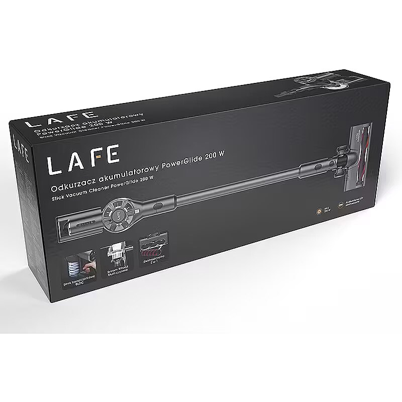 Description - Odkurzacz pionowy bezprzewodowy Lafe PowerGlide 200W Lafe PowerGlide 200W to nowoczesny odkurzacz akumulatorowy, który zapewnia wydajność i wygodę w codziennym sprzątaniu. Dzięki zaawansowanej technologii i funkcjonalnym rozwiązaniom, ten odkurzacz doskonale sprawdzi się w każdym domu, gwarantując czystość bez wysiłku. Silnik bezszczotkowy BLDC: Odkurzacz wyposażony jest w nowoczesny silnik bezszczotkowy BLDC, który zapewnia długą żywotność, wyższą wydajność oraz niższy poziom hałasu w porównaniu do tradycyjnych silników. System filtracji Multi-cyclone: Zaawansowany system filtracji Multi-cyclone skutecznie oddziela kurz i zanieczyszczenia, zapewniając efektywne odkurzanie oraz lepszą czystość powietrza. System ten pomaga utrzymać stałą moc ssania, nawet gdy zbiornik jest pełny. Elektroszczotka 2w1: Odkurzacz Lafe PowerGlide 200W wyposażony jest w uniwersalną elektroszczotkę 2w1, która doskonale radzi sobie z różnymi rodzajami podłóg, od twardych powierzchni po dywany. Dzięki temu sprzątanie jest szybkie i efektywne. Podświetlenie LED: Zintegrowane podświetlenie LED na głowicy odkurzacza precyzyjnie oświetla podłogę, sprawiając, że nawet najmniejszy kurz, zwykle niewidoczny na twardych powierzchniach, staje się widoczny. Dzięki temu podczas sprzątania masz pewność, że nic nie zostanie pominięte, a Twój dom będzie lśnił czystością. Pojemność akumulatora: 2200 mAh: Wytrzymały akumulator o pojemności 2200 mAh zapewnia do 35 minut pracy na jednym ładowaniu, co pozwala na efektywne sprzątanie większych powierzchni bez konieczności częstego ładowania. Czas ładowania baterii: ok. 5h Siła ssania 22 kPa: Dzięki sile ssania na poziomie 22 kPa, odkurzacz poradzi sobie z nawet najtrudniejszymi zabrudzeniami, zapewniając skuteczne usuwanie kurzu, włosów i większych zanieczyszczeń. Poziom hałasu: 75 dBA: Cicha praca odkurzacza na poziomie 75 dBA zapewnia komfortowe sprzątanie, bez nadmiernego hałasu, co jest szczególnie ważne w domach z małymi dziećmi lub zwierzętami. Pojemność zbiornika 0,5L: Zbiornik o pojemności 0,5 litra jest łatwy do opróżnienia i idealny do codziennych zadań, pozwalając na dłuższe sprzątanie bez potrzeby częstego opróżniania. 2 prędkości pracy: Odkurzacz oferuje dwa różne tryby prędkości, które można dostosować w zależności od rodzaju powierzchni oraz poziomu zabrudzeń. Wybierz optymalny tryb do szybkiego lub dokładnego sprzątania. Lafe PowerGlide 200W - Twój niezawodny odkurzacz pionowy. Dzięki dużej mocy, cichej pracy i nowoczesnym rozwiązaniom technologicznym, sprzątanie stanie się łatwiejsze, szybsze i bardziej efektywne.
