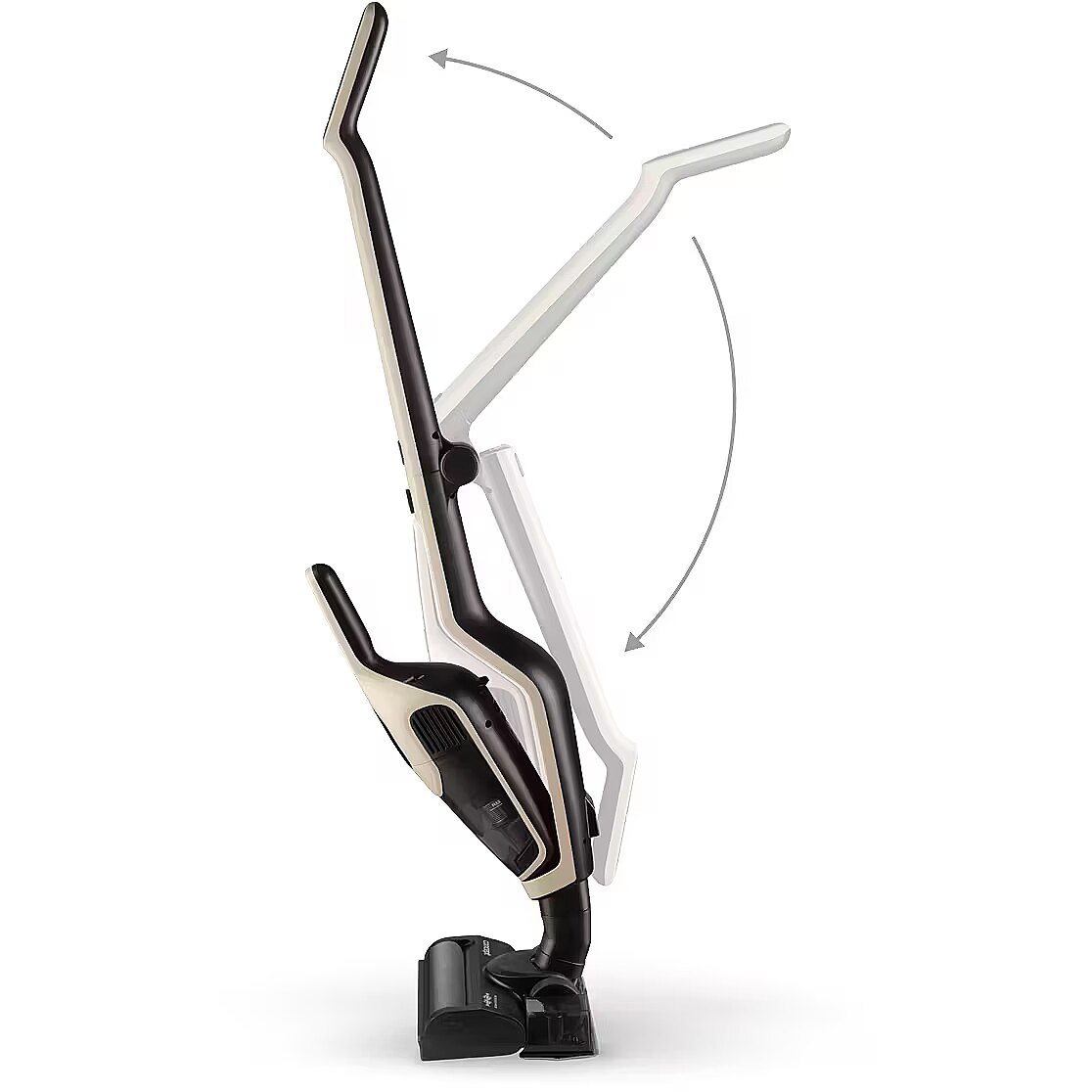 Odkurzacz pionowy został zaprojektowany z myślą o wygodzie, dlatego wyposażono go w składaną rączkę, która znacznie ułatwia przechowywanie nawet w mniejszych pomieszczeniach. Po sprzątaniu wystarczy złożyć urządzenie i odłożyć je np. do szafy lub za drzwi. W zestawie znajduje się także stacja ładująca, która zapewnia nie tylko wygodne ładowanie, ale również pełni rolę stabilnej podstawy do przechowywania odkurzacza wraz z akcesoriami.