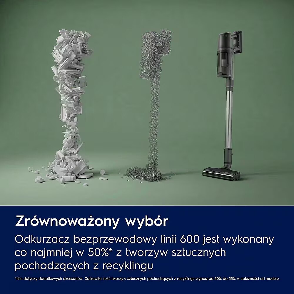 *Measured by comparison with the previous 600 cordless vacuum with a dust container filled with a DMT mixture (standard test) according to IEC 62885-4. Up to 50 minutes of cleaning on a single charge