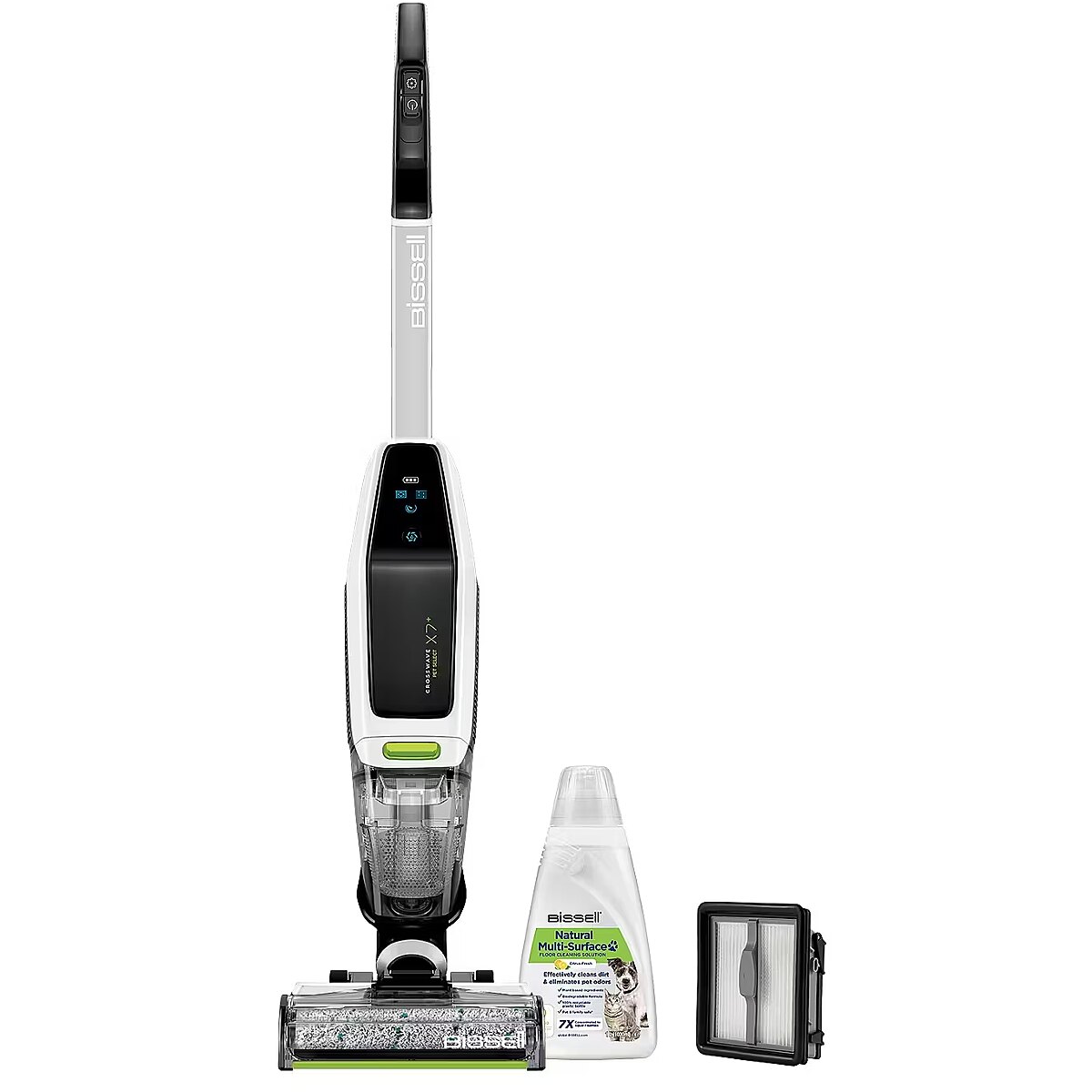 LongDesc - When wet cleaning, it vacuums and mops at the same time, across sealed hard floors and area rugs, combining cleaning steps and saving you time. Unlike when you use a mop and bucket, our Two-Tank Technology keeps the clean and dirty water separate. Therefore, with the CrossWave X7 Plus, you always clean your floors with fresh water. Our pet parent engineers incorporated three different cleaning modes: Hard Floor Mode, Area Rug Mode and TURBO PET™ Mode. The new TURBO PET™ mode boosts cleaning performance, especially for pet messes and everyday stuck-on messes. Natural Multi-Surface Pet cleaning solution eliminates pet odors leaving your home smelling fresh. When you’re done cleaning your floors, the self-cleaning cycle not only cleans the brush roll, but also the inside of the machine so that there is less clean-up after cleaning. Also, you can use the CrossWave® X7 Plus Cordless Pet for occasional vacuuming. Thanks to powerful suction, the device will easily pick up pet hair and dry debris from your hard floors. CrossWave® X7 Plus Cordless Pet multi-surface cleaner also has LED headlights to illuminate pet hair, dirt and debris while cleaning along baseboards and in corners. This machine doesn’t just clean up after pets, it helps save them! BISSELL® proudly supports BISSELL Pet Foundation® and its mission to help save homeless pets. When you buy a BISSELL® product, you help save pets, too. We’re proud to design products that help make pet messes, odours and pet homelessness disappear.*may vary based on mode and usage