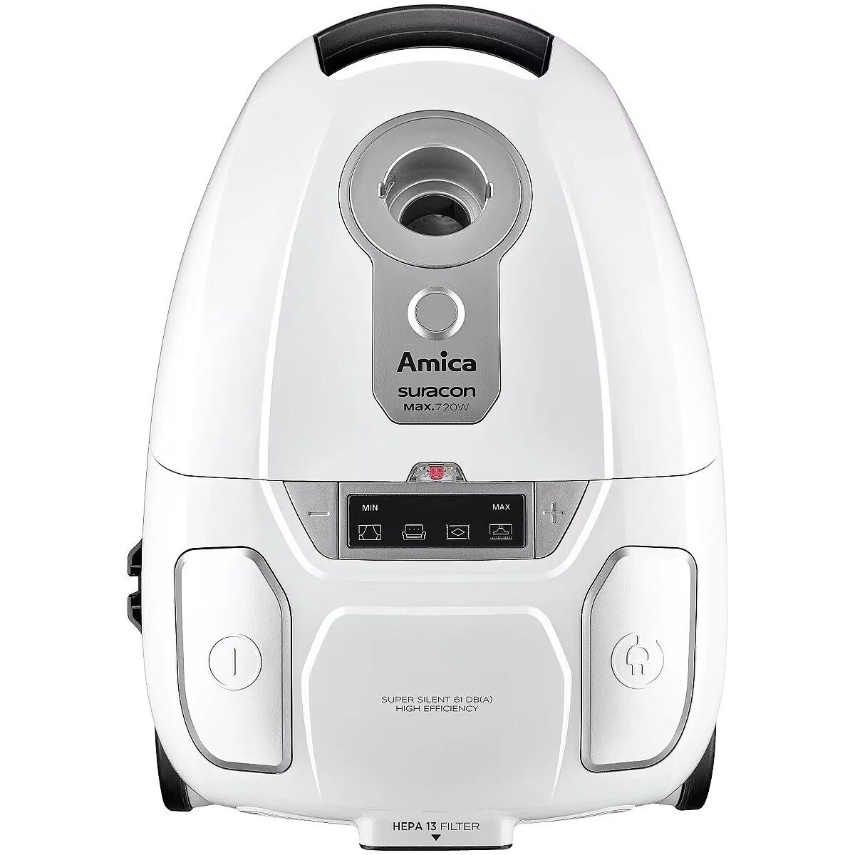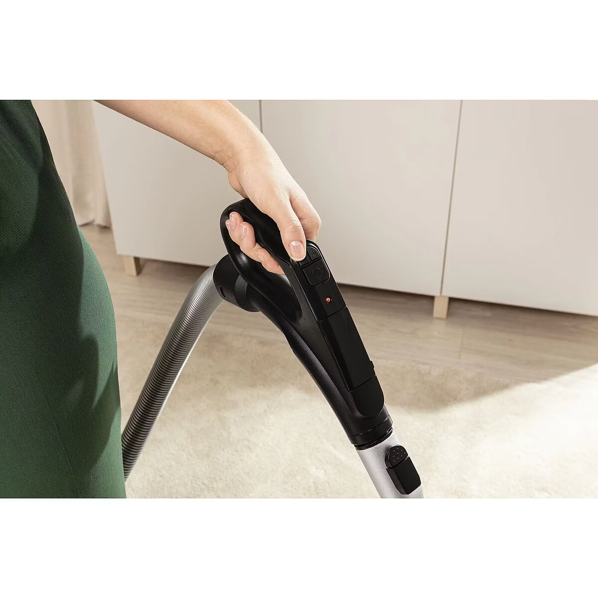 Koniec ze schylaniem się, by ustawić moc odkurzacza. Przyciski znajdujące się w rączce pozwalają na komfortowe włączanie, wyłączanie i regulowanie mocy odkurzania. Regulacja mocy w uchwycie umożliwia szybką reakcję jeśli tylko wciągniemy odkurzaczem zabawkę dziecka lub zasłonę. Filtr HEPA 13