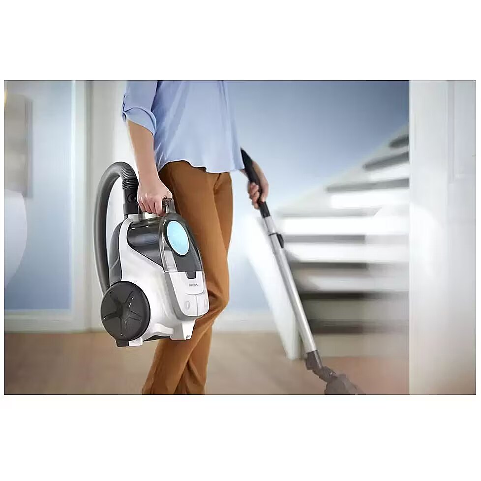 Technical Specifications: Power input: 750 W (typical) / 850 W (max) Noise level: ~77 dB Dust container capacity: 1.3 L Filtration: Super Clean Air filter, washable motor filter Technology: PowerCyclone 4 Tube: 2-piece telescopic metal Cord length: 6 m Operating radius: ~9 m Weight: ~4.0 kg Tools included: Multi-purpose nozzle + crevice tool Parking: Vertical and horizontal Colour: Arctic White / Sky Blue