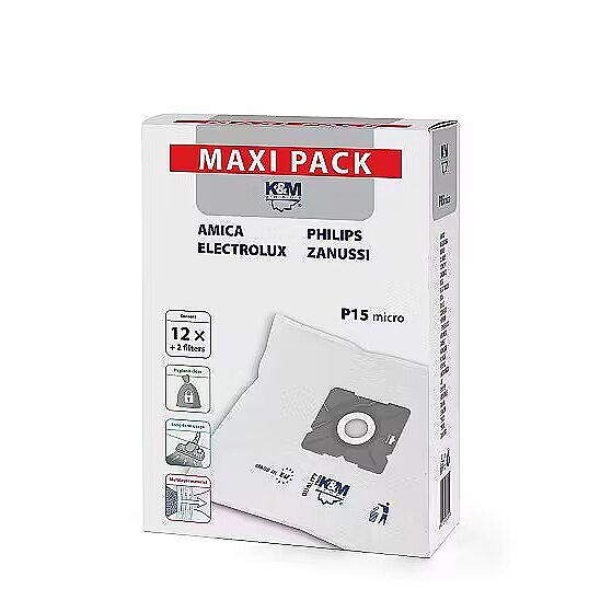 Description - Hoover bags P15/maxi 12 pcs Synthetic bags for hoovers: Amica, Philips, Electrolux, Zanussi, Midea 12 pieces + 2 filters.