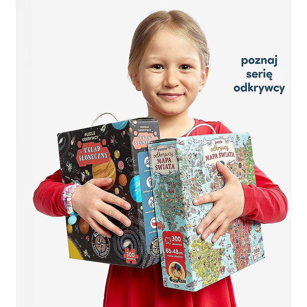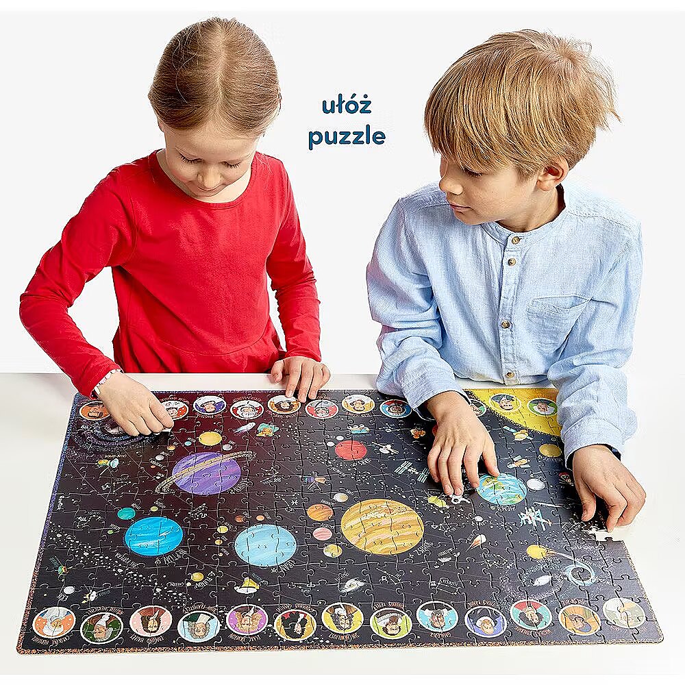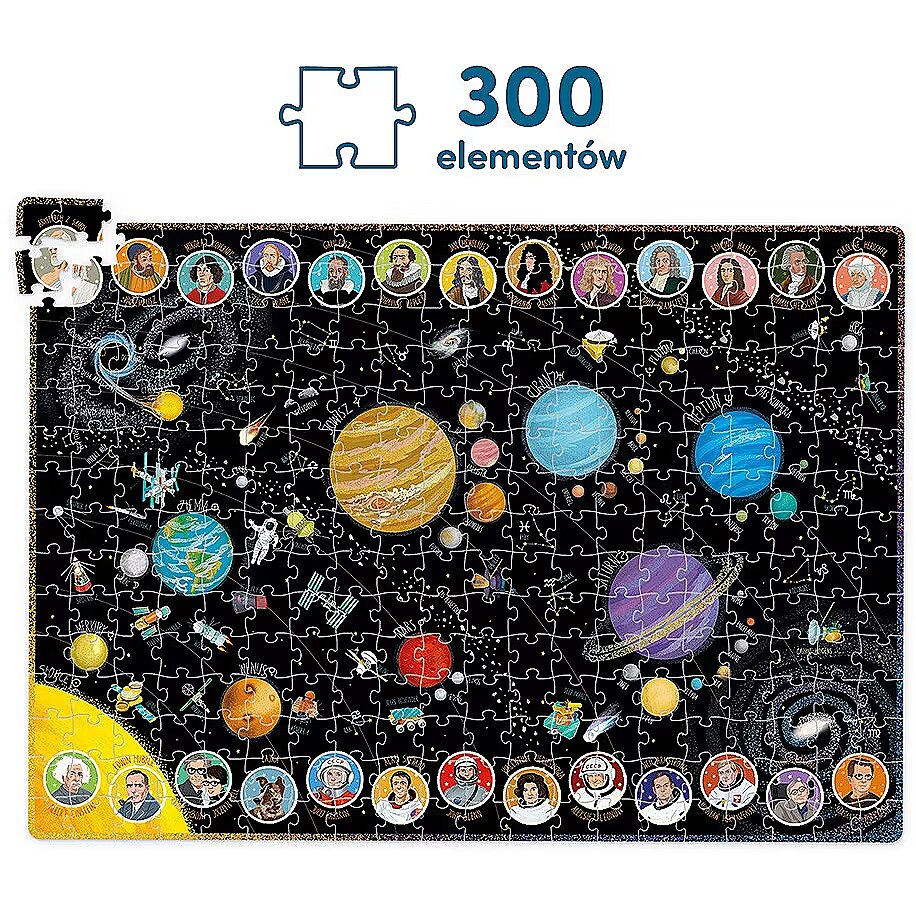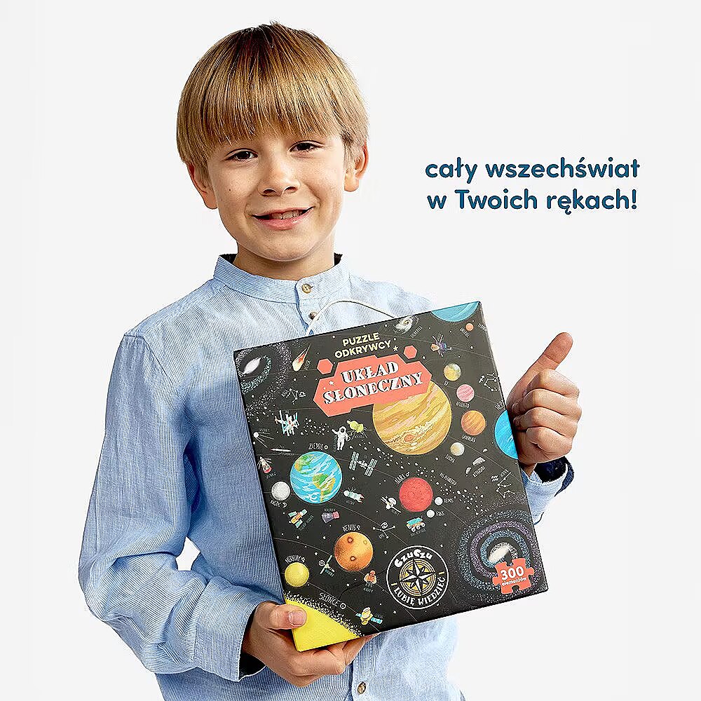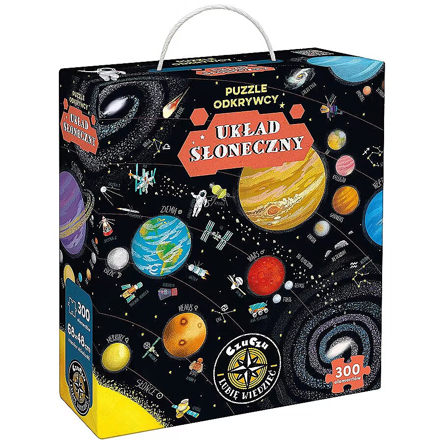 Description - Puzzle odkrywcy Układ Słoneczny Ułóżcie puzzle nie z tej Ziemi! Wiemy, jak pobudzać zainteresowanie i przekazywać nowe wiadomości w pełen humoru sposób. Pokazujemy, że nauka jest fajna, a wiedza daje moc! Duże, pełne szczegółów i pięknie zilustrowane 300-elementowe puzzle przedstawiają planety, księżyce, pojazdy kosmiczne, naukowców i odkrywców Układu Słonecznego. Edukacyjny doskonale zestaw sprawdzi się jako prezent dla ciekawego (wszech)świata ucznia i doskonale sprawdzi się jako puzzle rodzinne.
