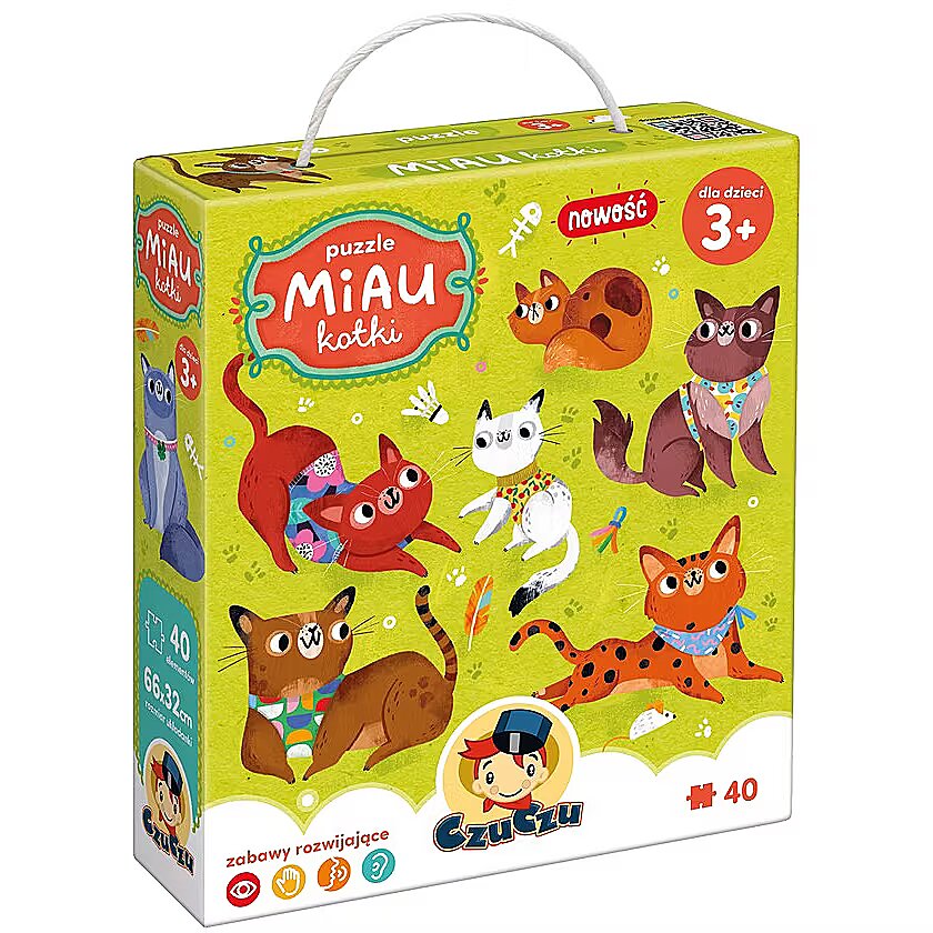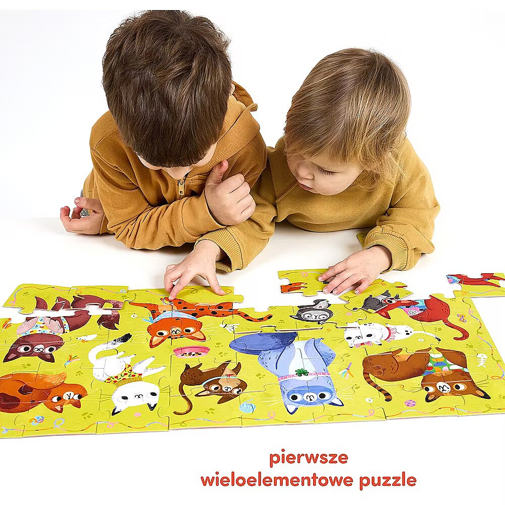 Description - Puzzle 40 pieces Meow - Kittens Puzzle cats are ready for mischief! Play with them while practicing fine motor skills and perceptiveness. A large, beautifully illustrated puzzle consists of 40 pieces. Meet 10 cats, kittens and kittens that are ready to play together. Puzzles are perfect as a gift for preschoolers and the youngest fans of furry pets. Solving puzzles is a fun game that allows you to improve various skills. Meow, who are you going to invite to puzzle together? Unique feature: beautifully illustrated puzzles encourage a variety of play. Have fun and improve various skills. The Miau Kittens puzzle consists of 40 elements and will be great as another puzzle challenge for three-year-olds and older. Fun for preschoolers is a natural field for experimenting and discovering the world, and cute cats and kittens inspire many developing activities. For example, you can: Start by putting the puzzle together Count the cats Make up stories about them Give them names Draw your own kitties Have fun finding details in the illustration Pretend to be cats and play like them! Let your imagination run wild, mrrr, meow!