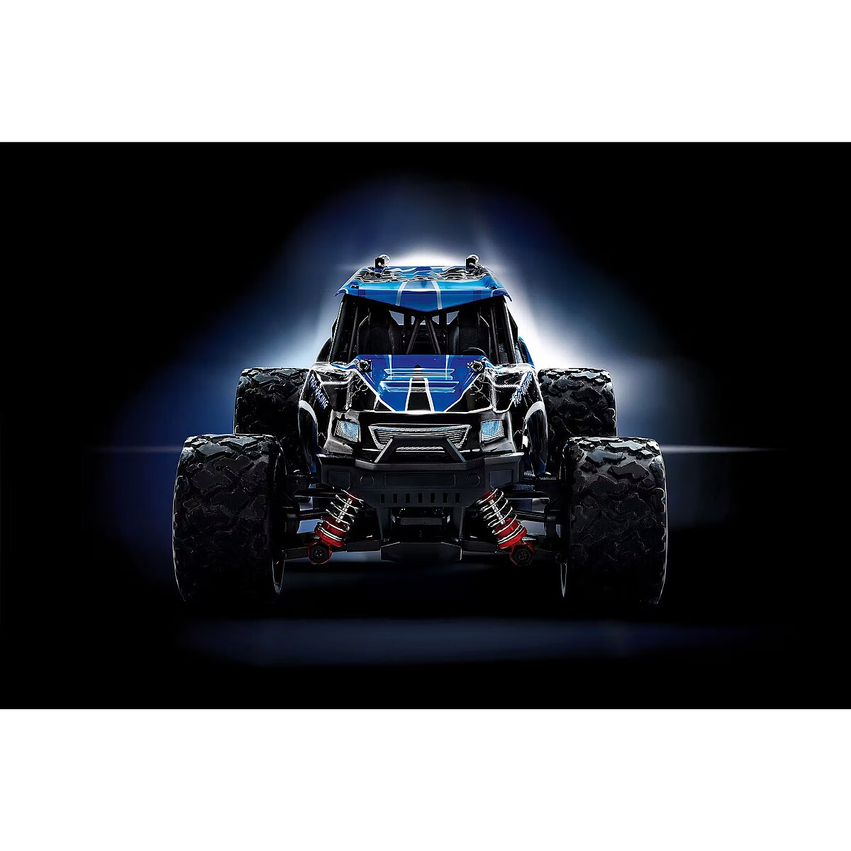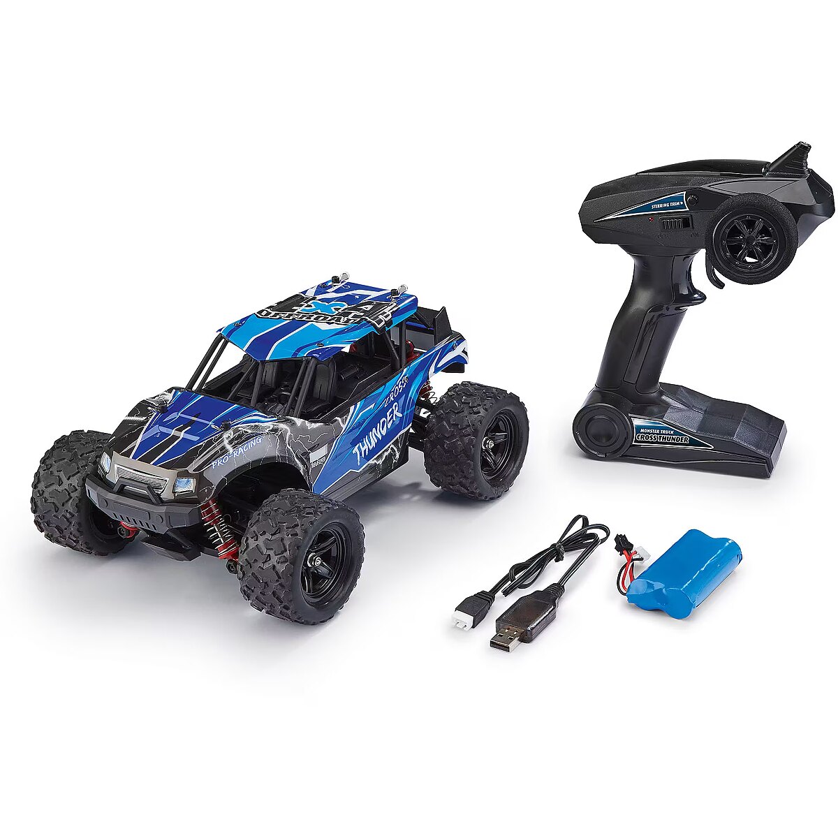 Mocny silnik elektryczny napędza napęd na wszystkie koła, a aby zapewnić prawidłowe poruszanie się do przodu również w terenie, niezwykle stabilne podwozie zostało wyposażone w ochronę przed uderzeniami, amortyzatory, 2 mechanizmy różnicowe, niezależne zawieszenie i mocne gumowe opony. Cyfrowo proporcjonalne wspomaganie kierownicy umożliwia precyzyjne kierowanie. Aby zapewnić możliwość jazdy również w prawdziwych wyścigach, Cross Thunder posiada 3-kanałowy pilot zdalnego sterowania 2,4 GHz, dzięki tej technologii różne pojazdy mogą być sterowane całkowicie niezależnie od siebie w tym samym czasie. Dołączony akumulator litowo-jonowy 7,4 V pozwala na jazdę do 20 minut i jest szybko ładowany za pomocą dołączonej ładowarki USB. RC Truggy 1:18 z mocnymi oponami, napędem na wszystkie koła i proporcjonalnym układem kierowniczym Atrakcyjny termoformowany korpus z plastikową klatką bezpieczeństwa Niezależne zawieszenie Mechanizm różnicowy z przodu i z tyłu oraz amortyzatory Wyjątkowo stabilne podwozie i zderzak Wysoka prędkość do 50 km/h z mocnym silnikiem elektrycznym Uwaga: do działania wymagane są 3 baterie 1,5 V (AA), nie są one dołączone.