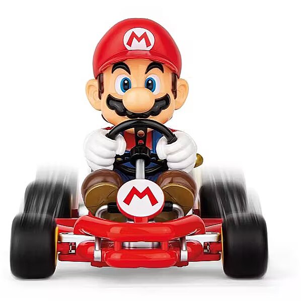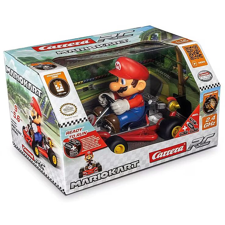 Description - Glide to victory with Mario in his very lightweight karts In Carrera RC Mario Kart Pipe Kart, Mario really steps on the gas in the local Mushroom Cup! The ultra-lightweight kart is a classic in the Mario Kart 8 and Mario Kart 8 Deluxe video games, and now also provides plenty of off-screen racing action. As a Carrera RC Kart, it is still tough enough to withstand the attacks of the bred blue tank. With this kart, you're not only a real eye-catcher when racing with friends, but also on your way to the winner's podium safely. Mario Kart action for the home With an original Nintendo licence, the beautifully designed character looks confusingly similar to his digital role model. With speeds of up to 9mph, Mario races against up to 15 other drivers to earn a place on the winner's podium. Hot racing lasts for up to 30 minutes before the sealed 3.2V 320mAh LiFePo4 battery is charged for 50 minutes via the supplied USB. With full function control technology, Mario is easy to drive even for beginners aged 6 and up. Step on the gas with Mario and take the Mushroom Cup home!