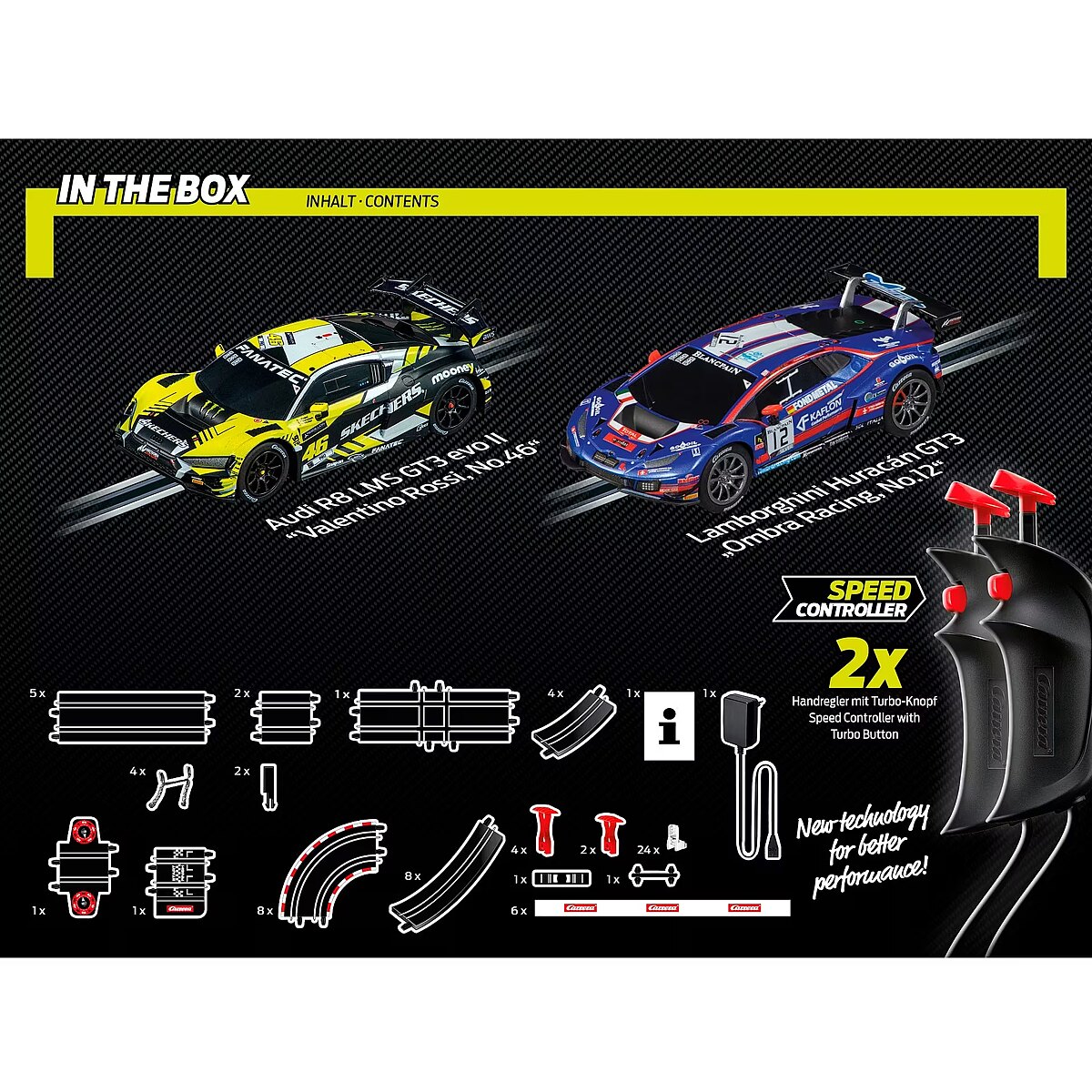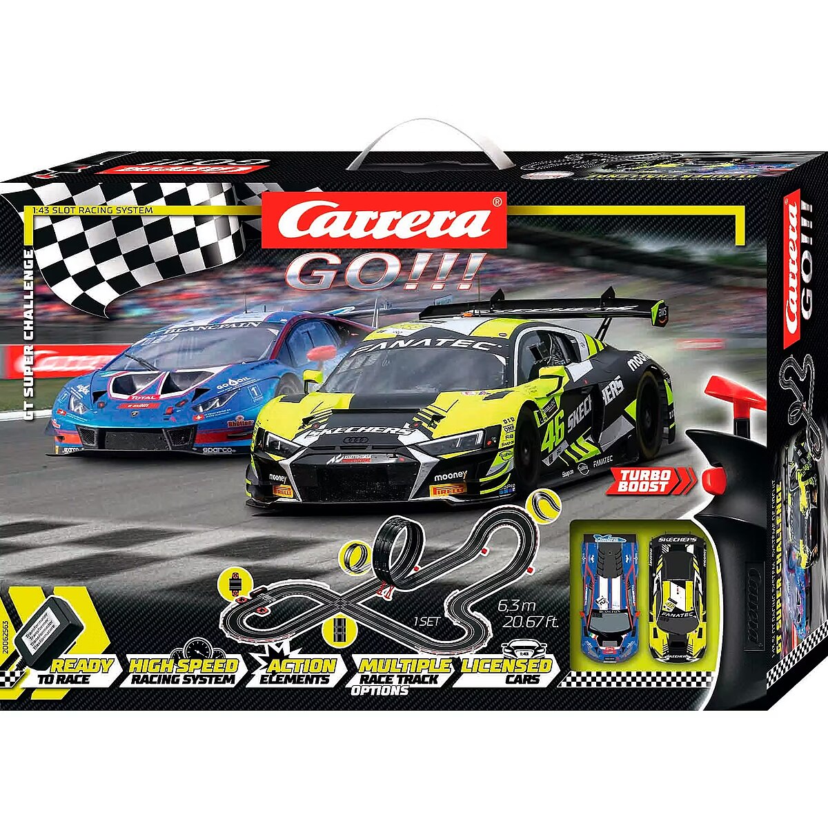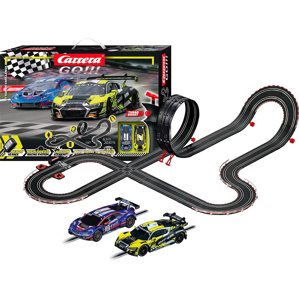 Technical_details - 6.3 meter track length and two stylish GT racing cars: This is the “GT Super Challenge” racetrack set from the Carrera GO!!! series. With the two hand controls included, the Audi R8 LMS GT3 evo II racing car, driven by nine-time motorcycle world champion Valentino Rossi, competes against the Lamborghini Huracán GT3 “No. 8". Crossing, fly-over and a nerve-wracking loop ensure unique racing fun. Item no.: 100025226 Kind of racetrack EAN 4007486625631 Manufacturer no. 20062563 GO!!! series Contents/equipment 2 vehicles, GO!!! connection rail, crossing, hand controller, lap counter rail, 3 straights 100 mm, 3 straights 114 mm, 2 curves (1/90°), 2 straights 342 mm, looping set, GO !!!-Transformer System Carrera GO!!! Number of drivers 2 drivers Age recommendation from 6 years Target group school children Vehicle(s) type analogue Caution: Danger of suffocation due to small parts that can be swallowed! Roadway type solid tracks Control connection wired Warnings Warning: Not suitable for children under 36 months! Dimensions width: 1,750 mm x depth/length: 1,220 mm