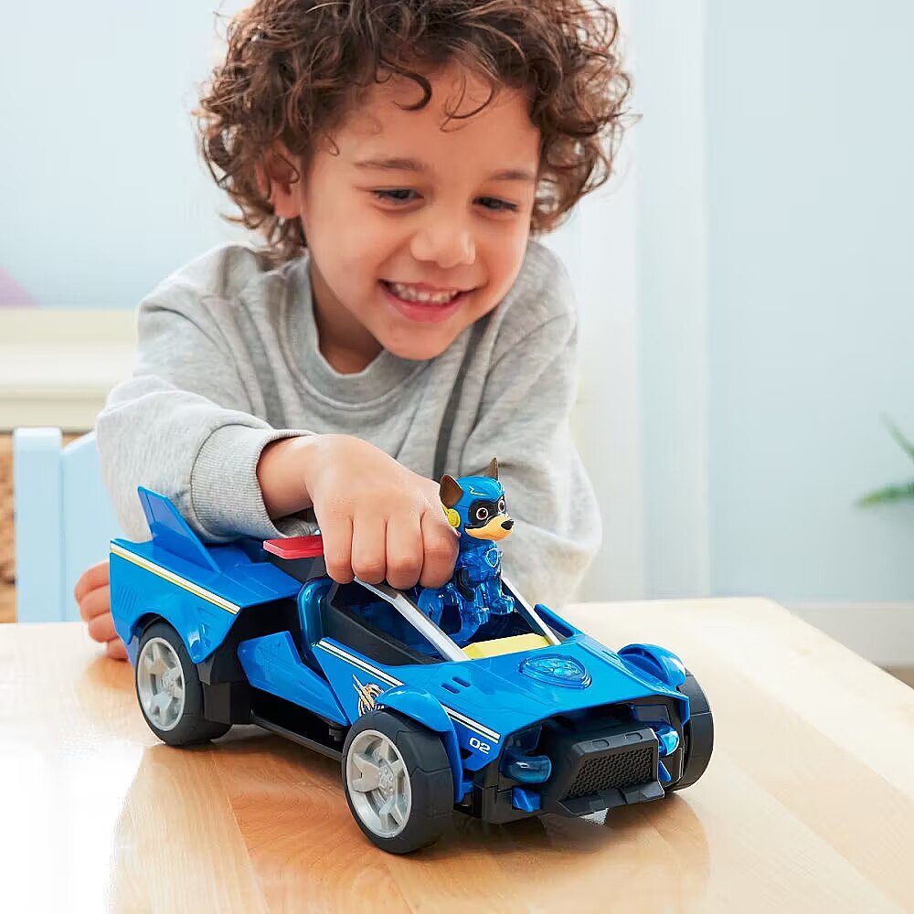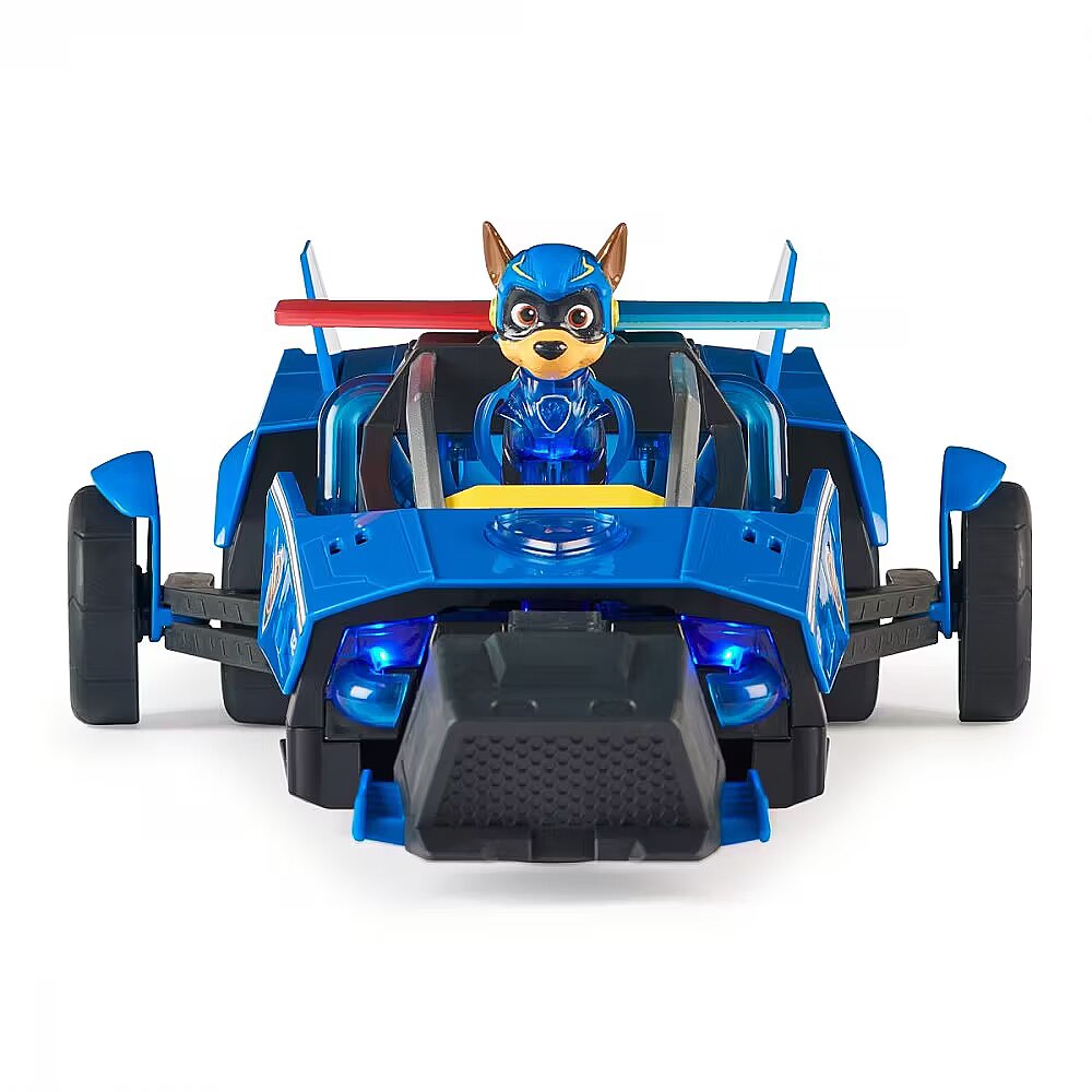 LongDesc - Team up with Chase and his PAW Patrol: The Mighty Movie rescue vehicle, for exciting rescue adventures right off the big screen! This PAW Patrol toy car measures over 12-inches long, 6-inches wide and stands 4-inches tall, with a super-sleek design, an awesome vehicle transformation and exciting sound effects and music, with synchronized flashing lights, that you see and hear in the movie! This deluxe police themed race car rescue vehicle would make a great gift for kids that are fans of the PAW Patrol Movie (Batteries Included)! Dressed in his blue PAW Patrol: The Mighty Movie uniform, with translucent sections and a cool helmet, clip your Chase action figure onto the seat of his police car toy to illuminate multiple areas on Chase and his vehicle, and watch his paws light up! Then, when it’s time for an action packed rescue mission, press down on Chase to activate his vehicle transformation, into rescue mode, which extends his vehicle to over 15-inches long and a whopping 8-inches wide, as you roll your toy car around from one mission to another! With PAW Patrol toys, a kid can explore his or her imagination and develop their motor skills through pretend play while reliving their favorite scenes from the movie! For even more fun and exciting PAW Patrol series-inspired missions, collect all the PAW Patrol movie toys, like the awesome Aircraft Carrier HQ and all the special edition PAW Patrol toys for girls and boys, like the Mighty Pups, Aqua Pups and Big Truck Pups toy figures and playsets (each sold separately) to enjoy endless PAWsome adventures with your favorite hero pup, in the Chase Mighty Transforming Cruiser!Includes: 1 Figure, 1 Vehicle