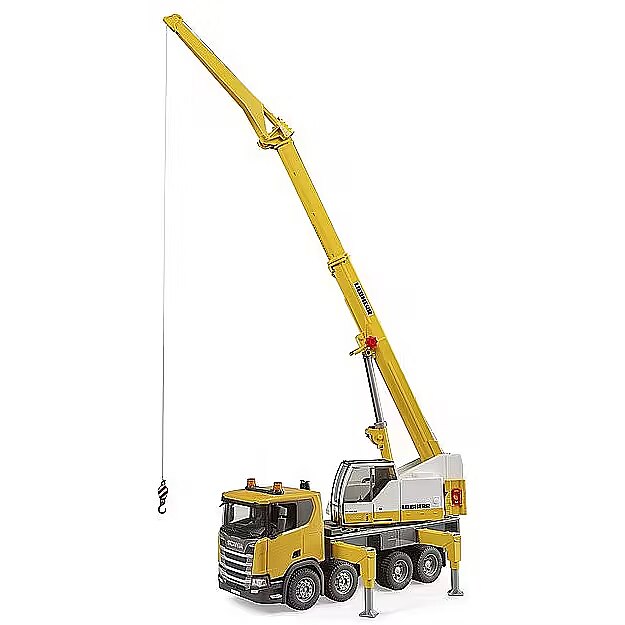 Description - Scania Super 560R Liebherr crane truck with light and sound module Movable door Extendable crane arm with height adjustment and hook Counterweight can be filled with sand or gravel The crane boom can be extended by means of a tip attached to the side The crane body can be rotated through 360°